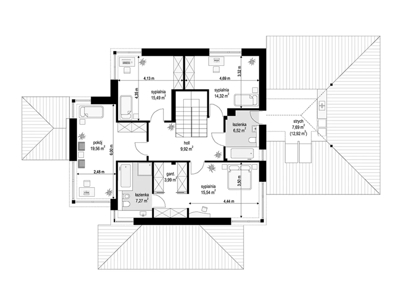 W rezydencji znajduje się aż 6 przestronnych pokoi, które można wykorzystać na sypialnie, gabinety czy pokoje dla gości. Praktyczna spiżarnia pozwala na wygodne przechowywanie zapasów i codziennych produktów spożywczych. Atutem tego projektu domu jest duża kotłownia, która pozwala na zastosowanie wydajnego kotła gazowego c.o. oraz wentylacji mechaniczno-nawiewno-wywiewnej. Bez podpiwniczenia - prostsze i szybsze prace budowlane.