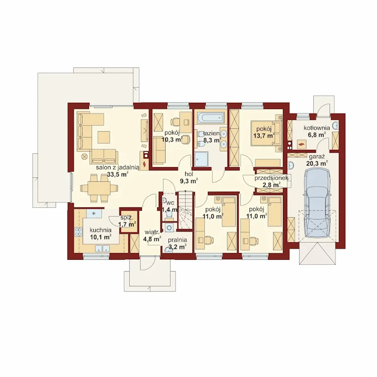 Wypełnij formularz i otrzymaj rysunki w pdf z dokładnymi wymiarami budynku i pomieszczeń (długość, szerokość, wysokość) dla projektu Domena 104 A-T