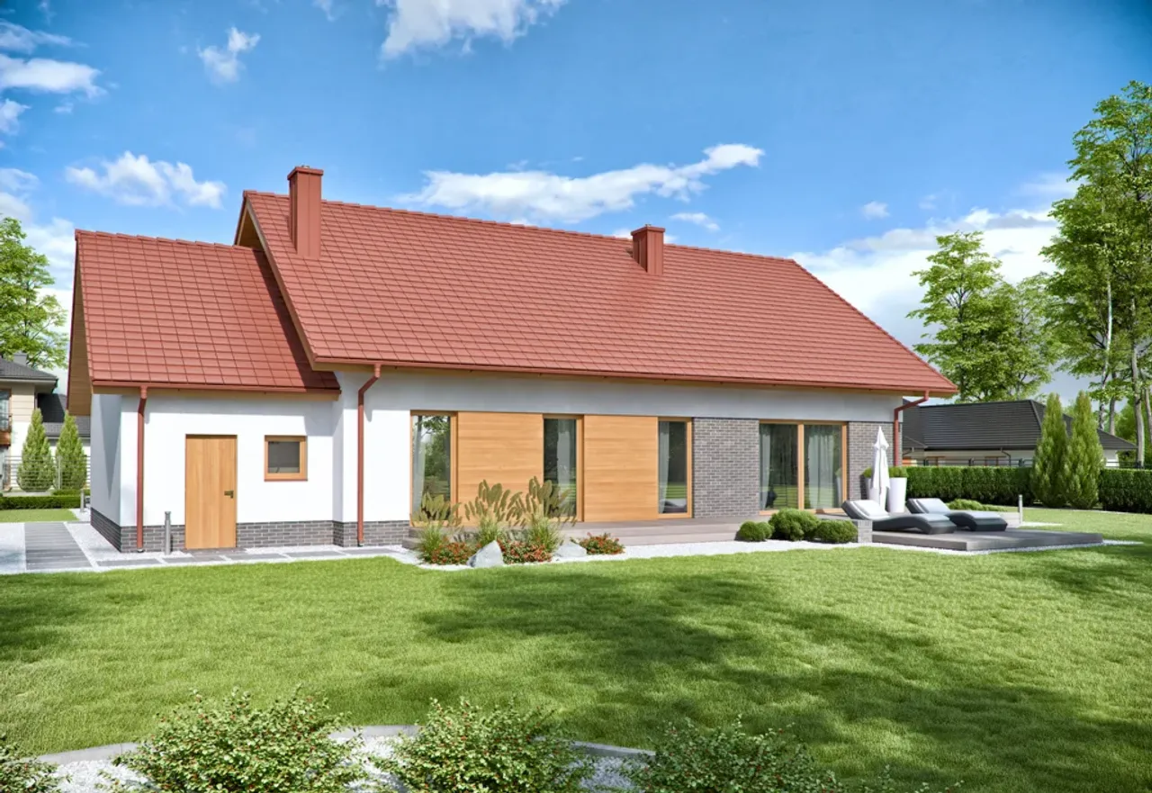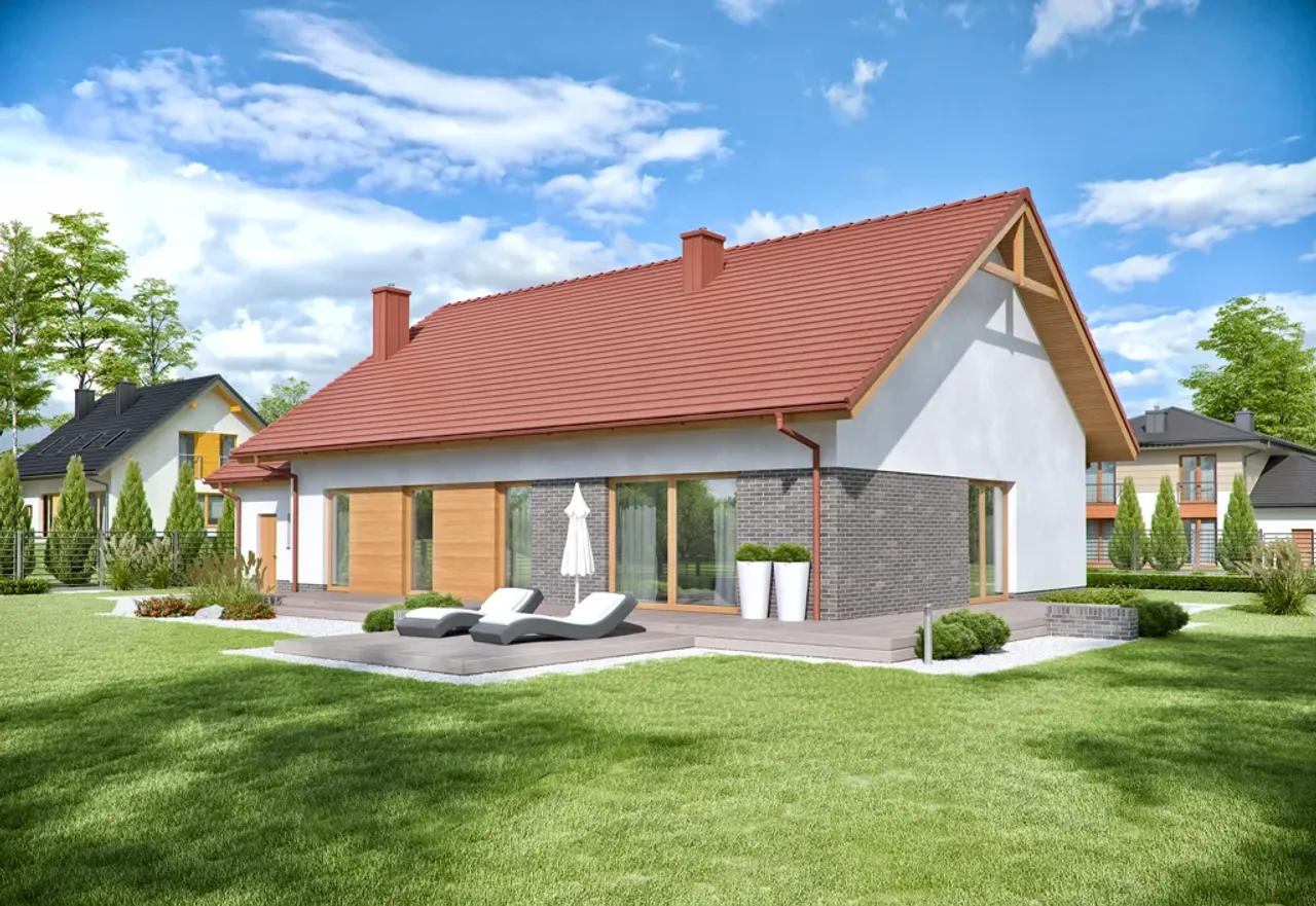 Projekt Domu Domena 106 jest przemyślany pod każdym kątem. Przestronne pokoje, duży salon z jadalnią oraz wyjście na taras jest idealne do codziennego życia rodzinnego oraz do organizacji przyjęć. To projekt, który łączy funkcjonalność i estetykę, a także uwzględnia potrzeby osób ceniących otwartą przestrzenię życiową.
