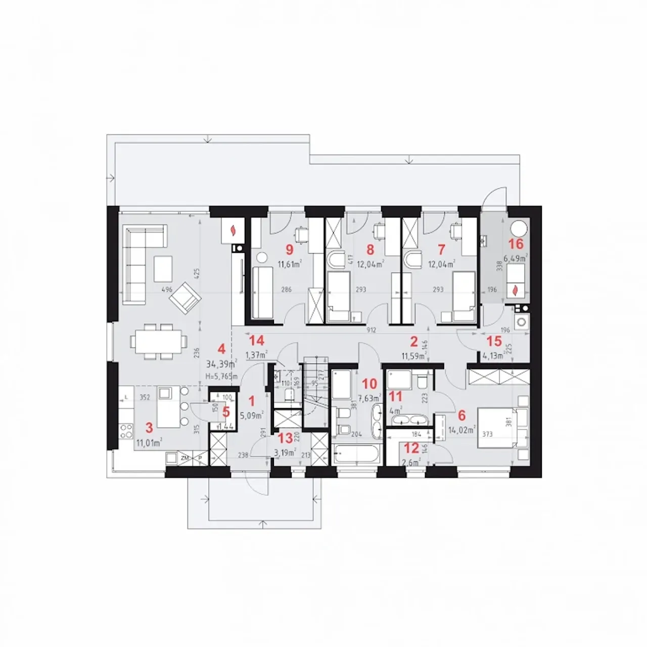 - rzuty poziome kondygnacji (rozmieszczenie i zwymiarowane wielkości pomieszczeń, umiejscowienie kominów, wentylacji, urządzeń sanitarnych i kuchennych) w skali 1:100