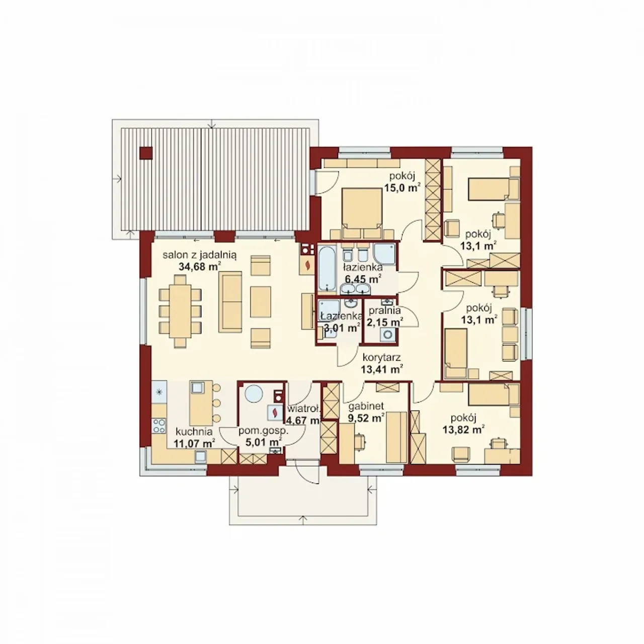 Wypełnij formularz i otrzymaj rysunki w pdf z dokładnymi wymiarami budynku i pomieszczeń (długość, szerokość, wysokość) dla projektu DOMENA 141 C