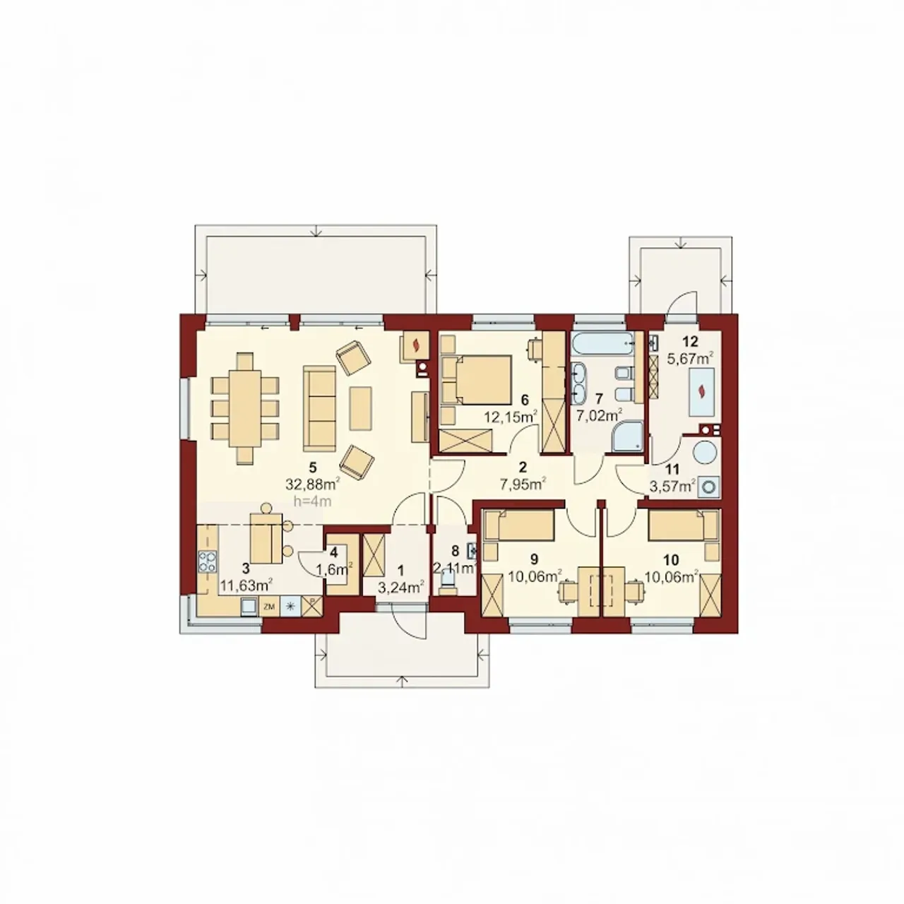 - Pokrycie dachu: blachodachówka lub dachówka cementowa.