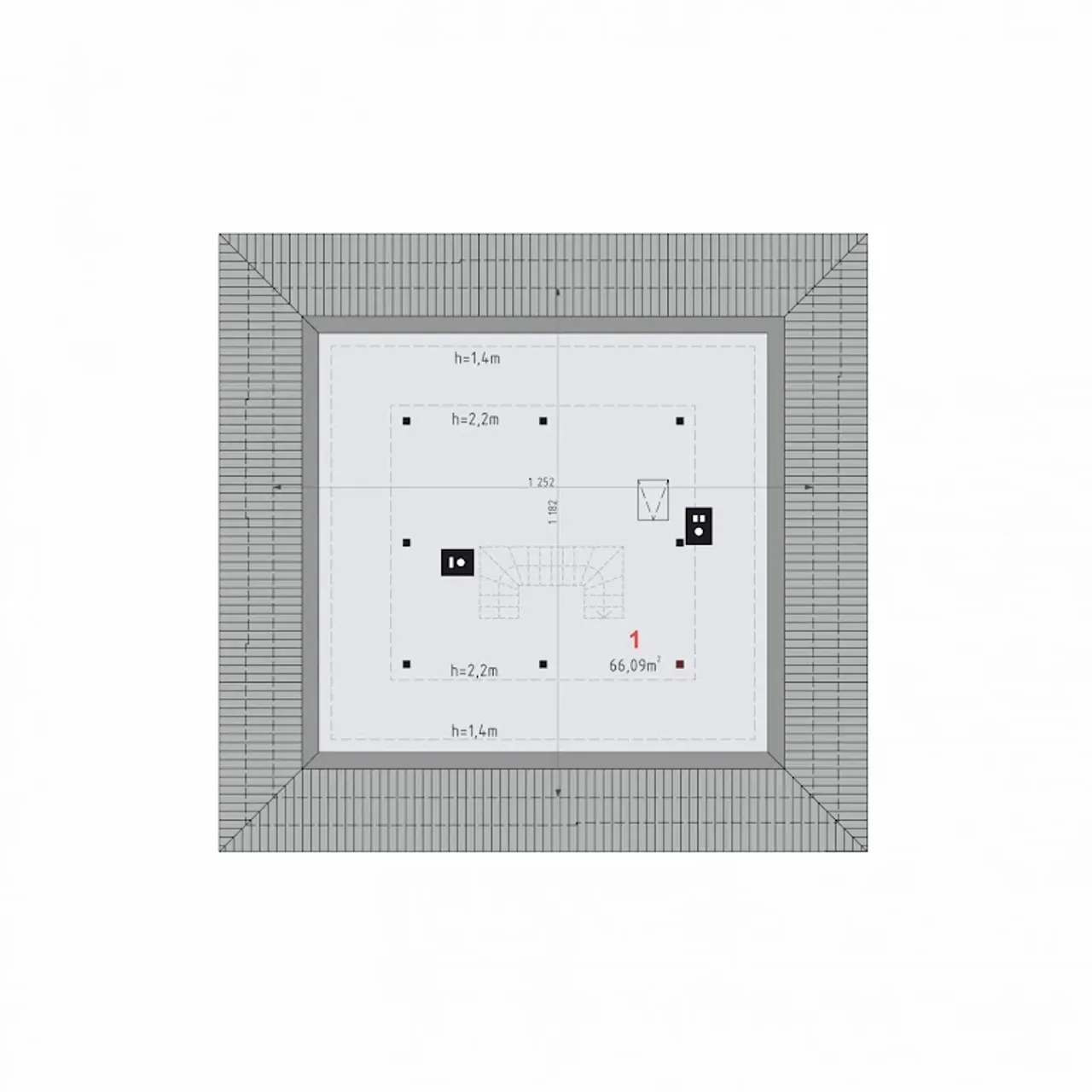 - rzuty poziome kondygnacji (rozmieszczenie i zwymiarowane wielkości pomieszczeń, umiejscowienie kominów, wentylacji, urządzeń sanitarnych i kuchennych) w skali 1:100