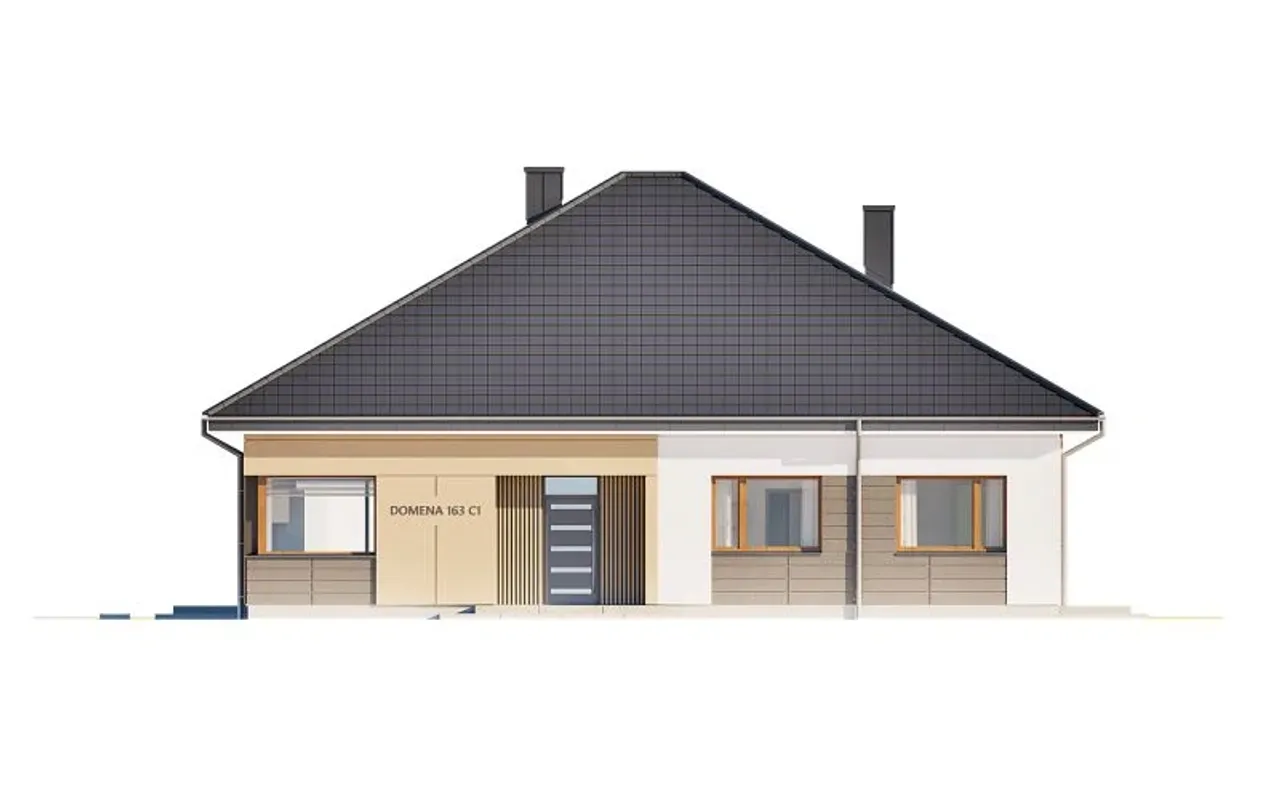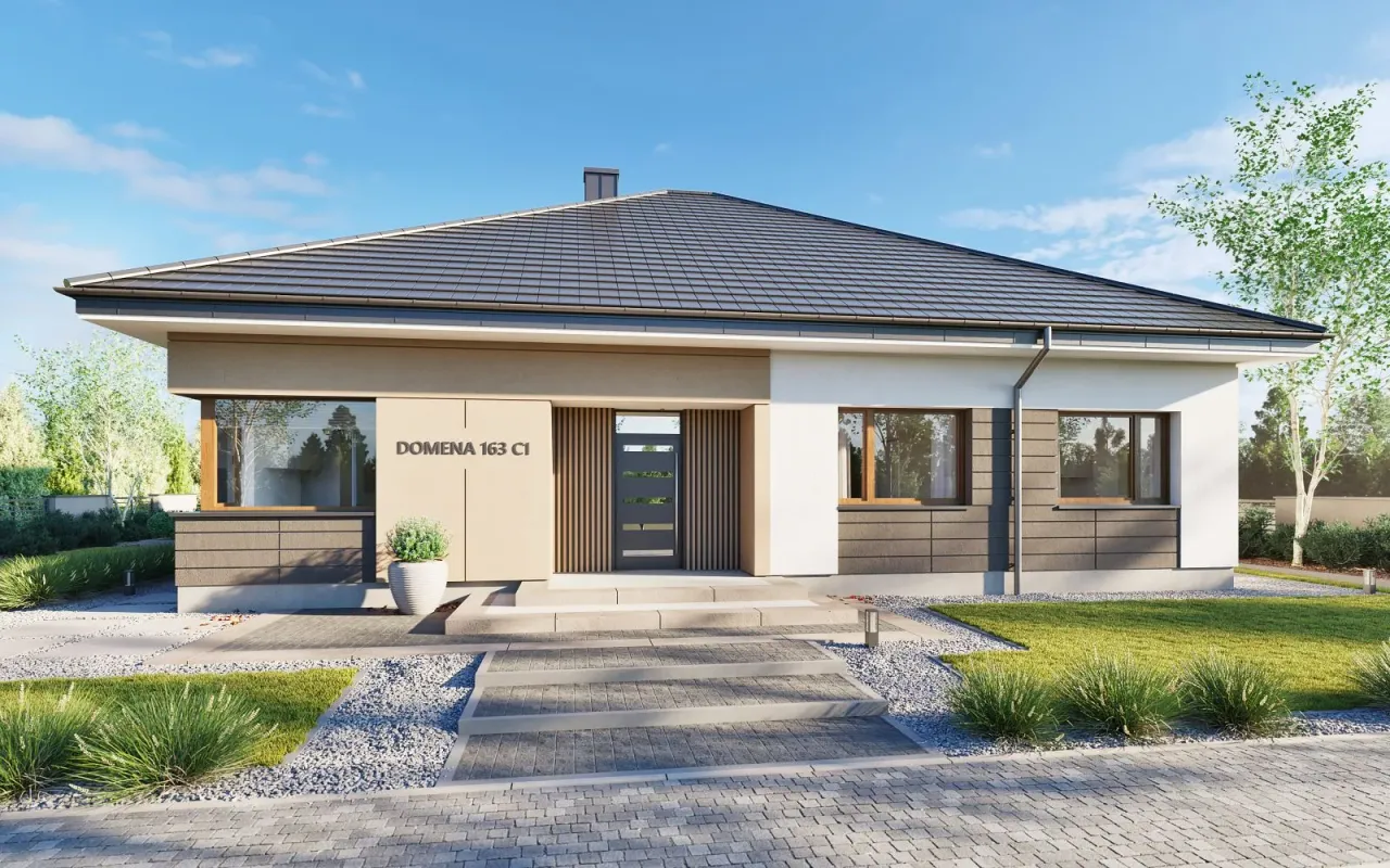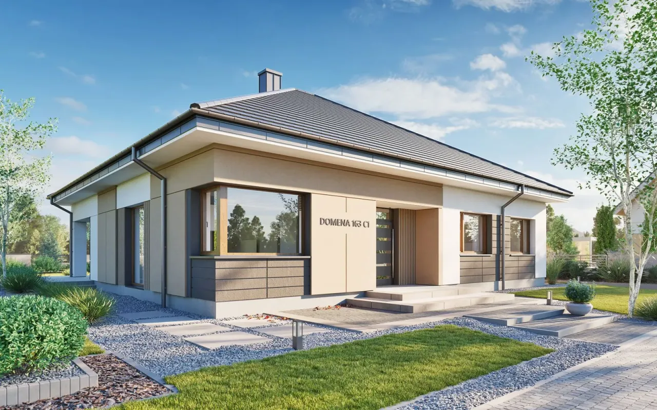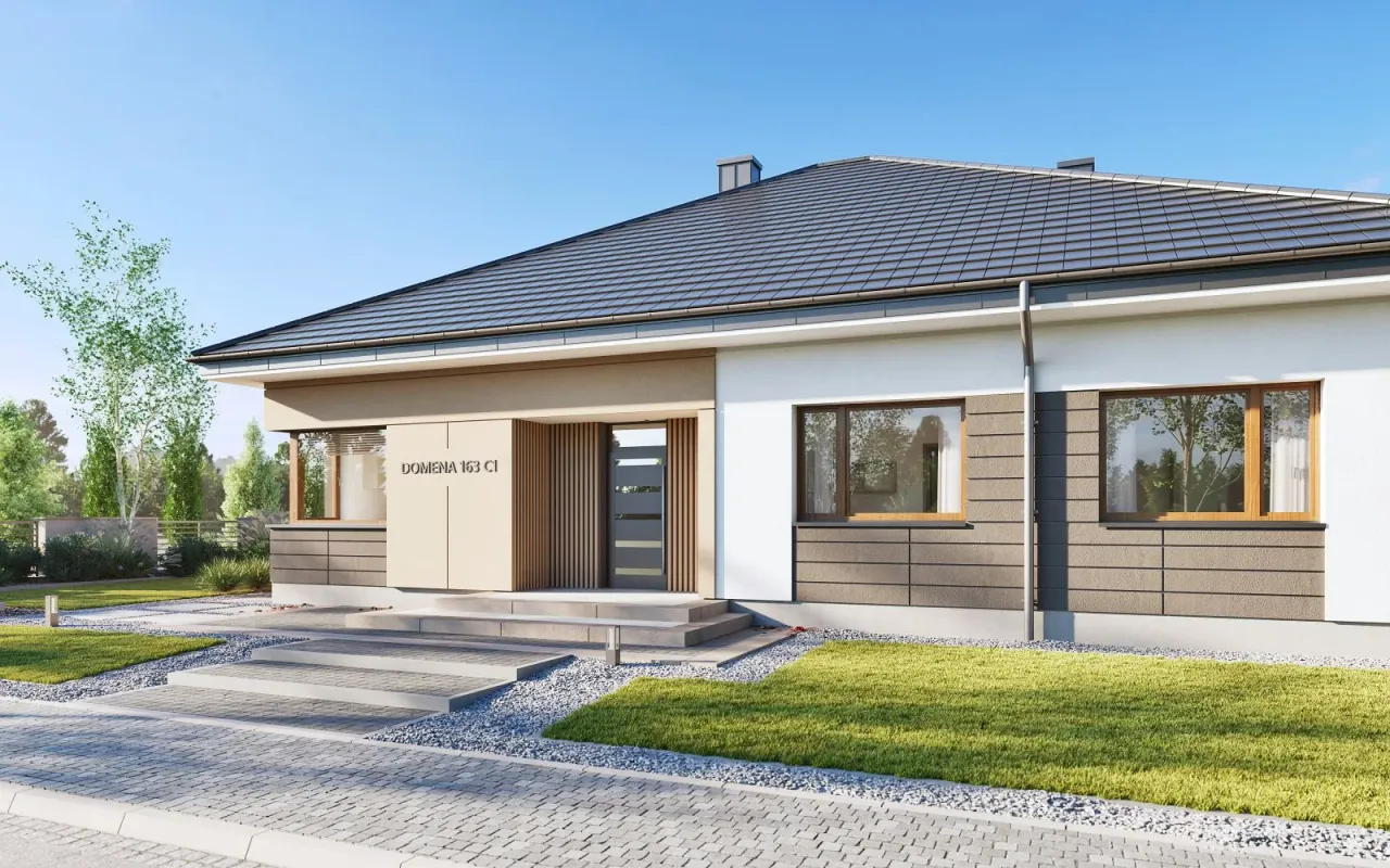 Projekt domu Domena 163 C1 przedstawia nowoczesny, parterowy dom jednorodzinny zaprojektowany z myślą o funkcjonalnym życiu rodziny przez cały rok. Przemyślany układ pięciu pokoi, rozsądna konstrukcja bez garażu oraz podkreślona współczesna stylistyka tworzą spójną i praktyczną wizję domu.