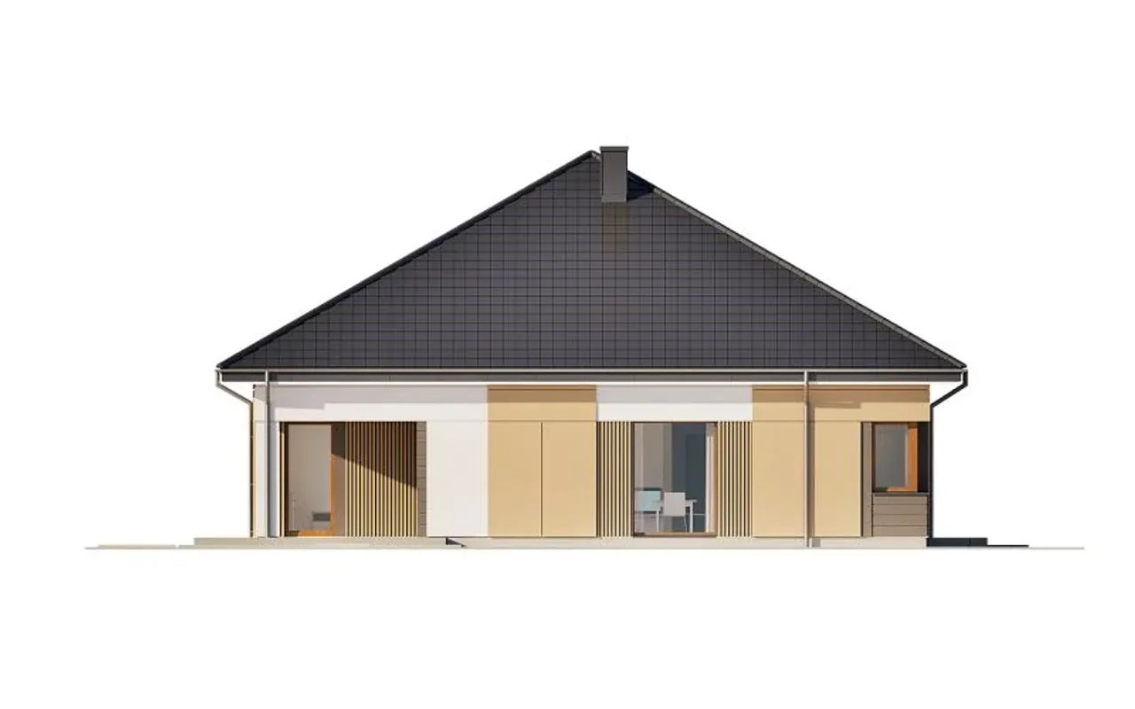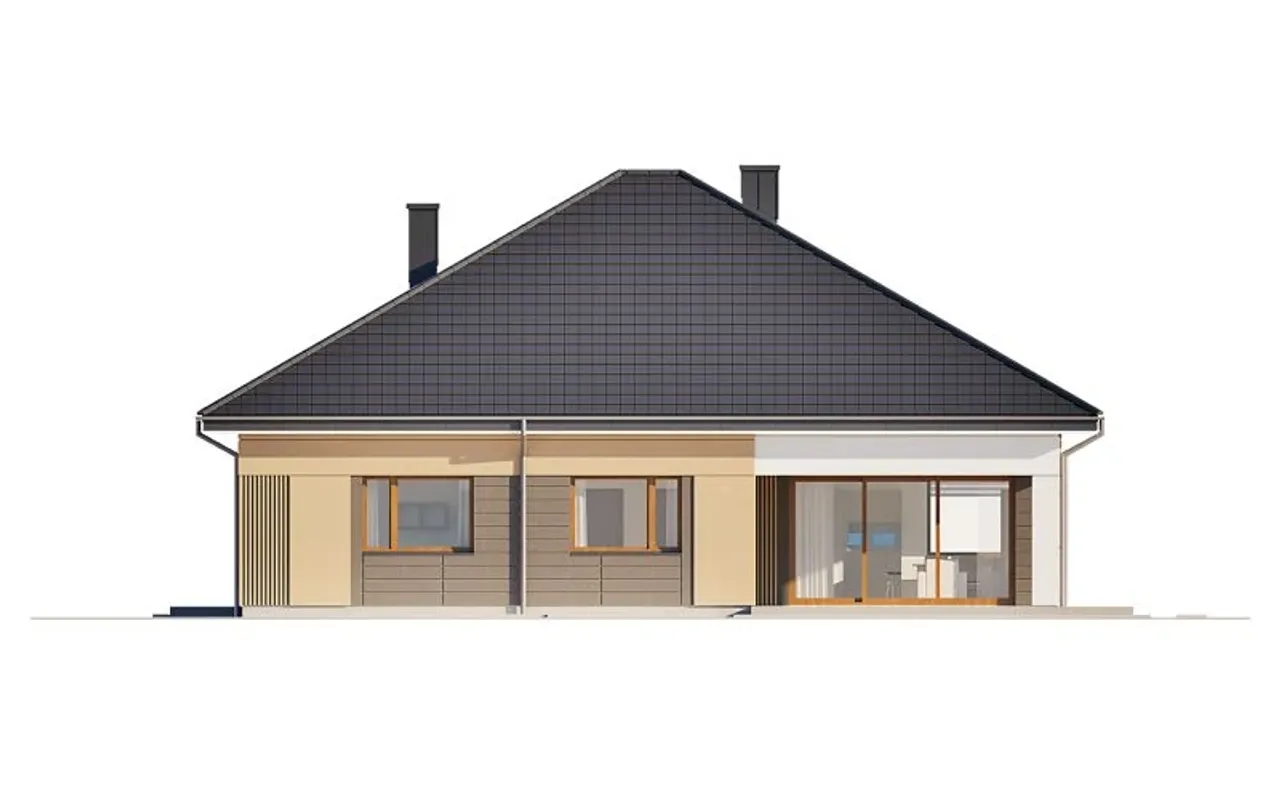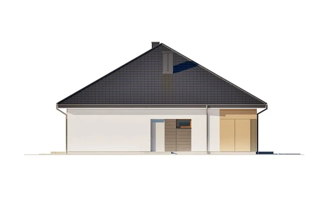 Projekt opisuje dom jednorodzinny całoroczny, w całości parterowy, bez podpiwniczenia i bez garażu, z kalenicą ułożoną równolegle do drogi. Taki układ ułatwia usytuowanie budynku na działce i sprzyja czytelnemu podziałowi stref: dziennej, nocnej oraz gospodarczej. Dach wielospadowy o kącie nachylenia 30° tworzy zgrabną, nowoczesną sylwetkę i pozwala dopasować pokrycie do upodobań inwestora - blachodachówka lub dachówka.