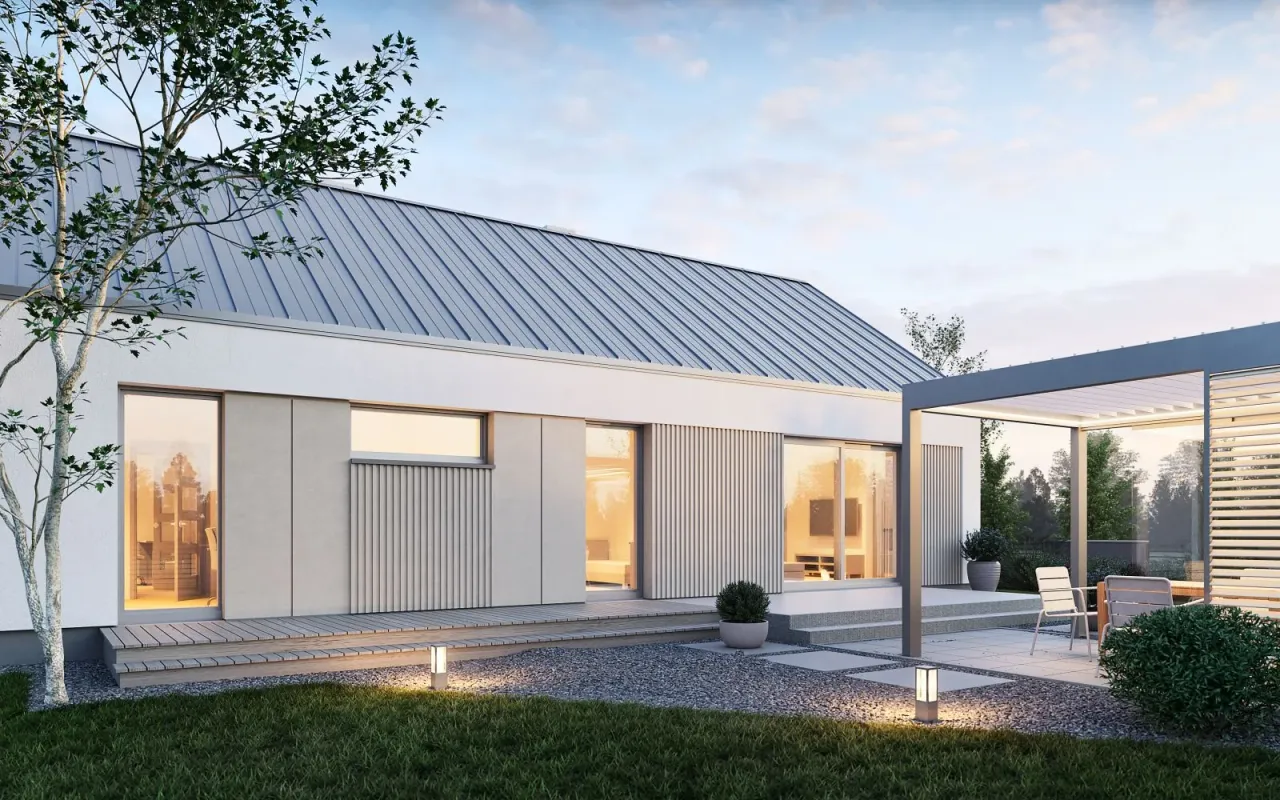 - Elewacje: tynk – System firmy TERMO ORGANIKA, lamele elewacyjne.