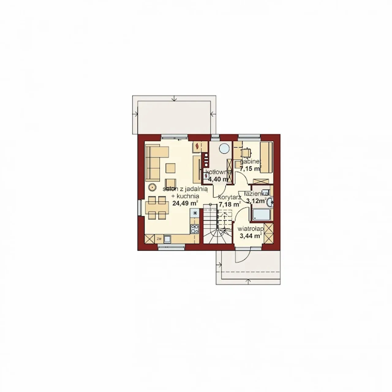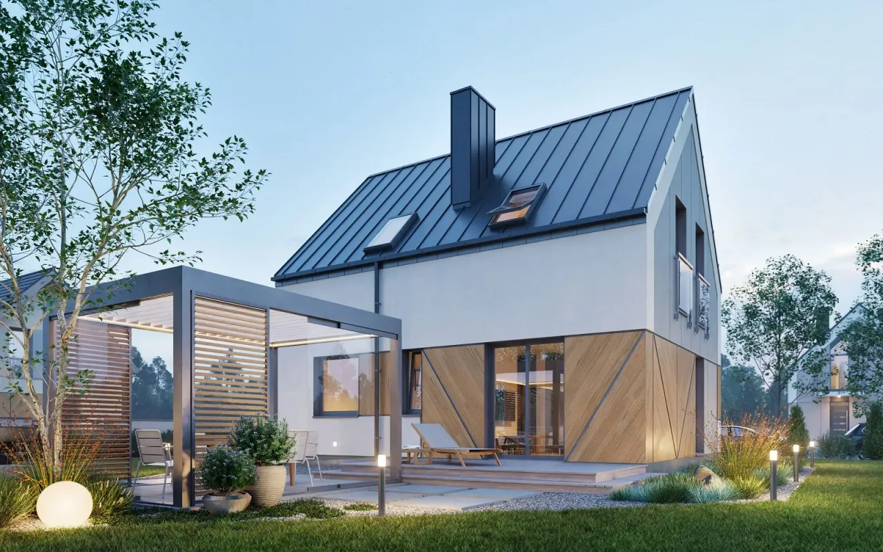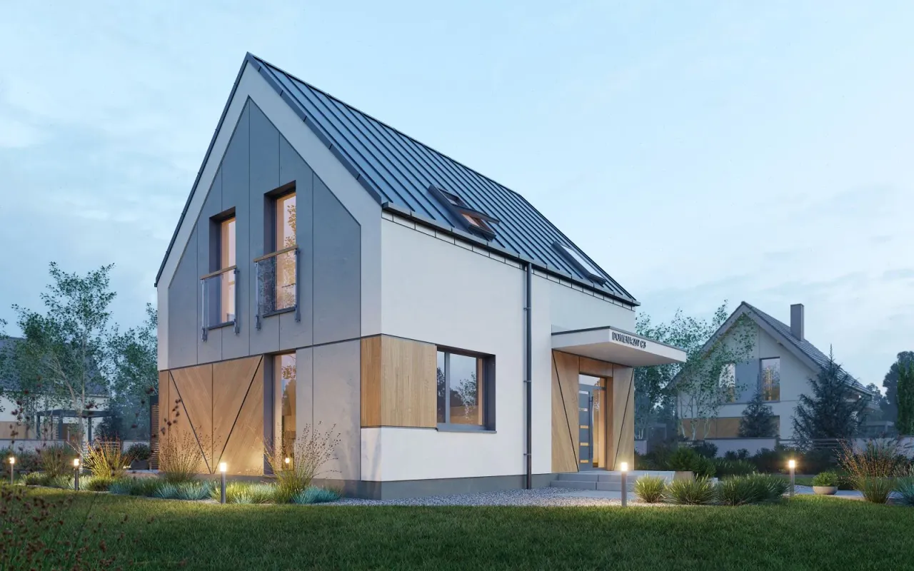 - Elewacje: tynk - systemowy firmy TERMO ORGANIKA, tynk lub okładzina imitująca drewno.