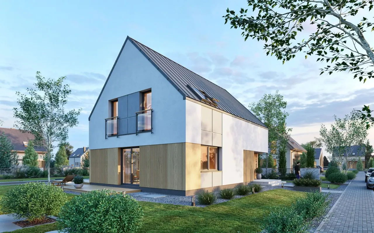 - Elewacje: tynk - systemowy firmy TERMO ORGANIKA, tynk lub okładzina imitująca drewno, tynk lub lamele imitujące drewno.