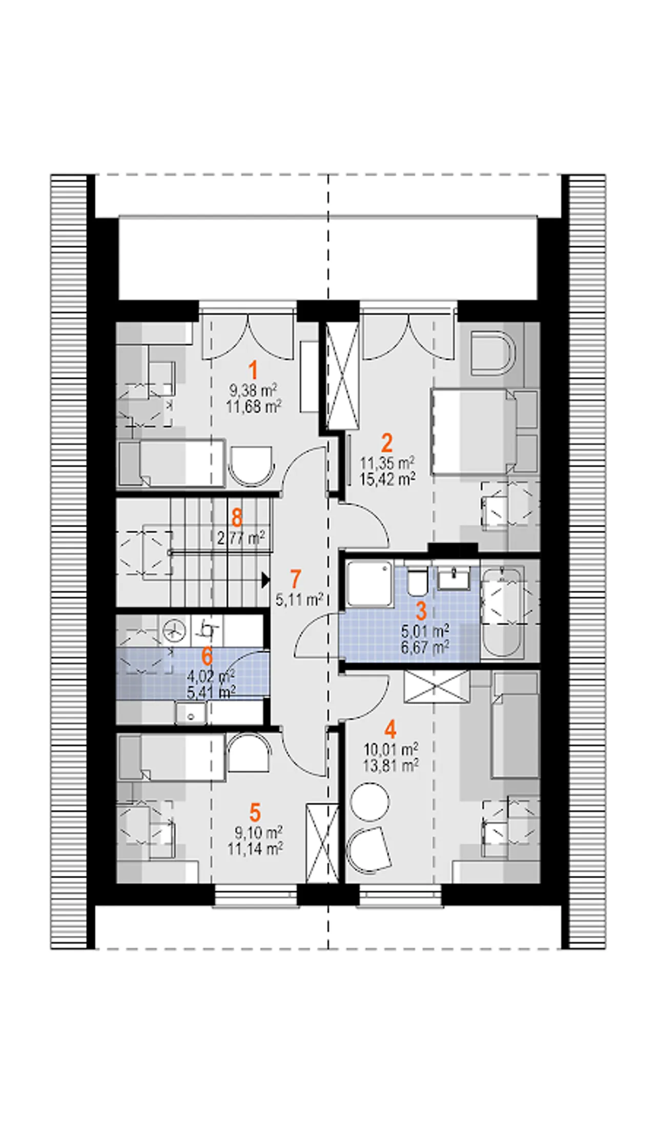 - rzuty wszystkich kondygnacji- pokazuje rozmieszczenie poszczególnych pomieszczeń i ich wymiary, powierzchnie, rozmieszczenie ścian, rozmieszczenie otworów drzwiowych, okiennych, urządzeń kuchennych i sanitarnych