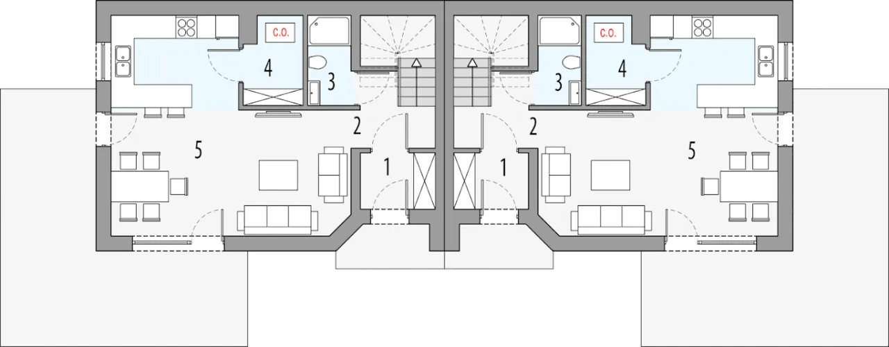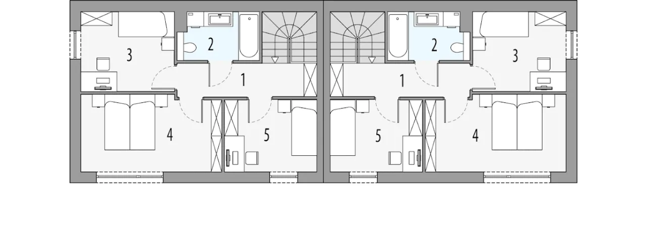 Projekt domu Dori - bliźniak L.LL to prawdziwy klejnot wśród projektów domów dla rodzin szukających współczesnego designu z nutą intymności. Wyrafinowana elegancja połączona z funkcjonalnością sprawia, że każdy metr kwadratowy tego domu ma swoje unikalne przeznaczenie. Ciekawe rozwiązania architektoniczne, jak choćby atrakcyjnie zaplanowane przestrzenie wspólne, zachęcają do spędzania czasu z najbliższymi, kreując przy tym domową atmosferę pełną ciepła i spokoju. Symetryczna fasada z subtelnymi detalami architektonicznymi nadaje całości nowoczesnego, ale i niepowtarzalnego charakteru, który z pewnością oczaruje każdego, kto ceni sobie unikalność i styl.