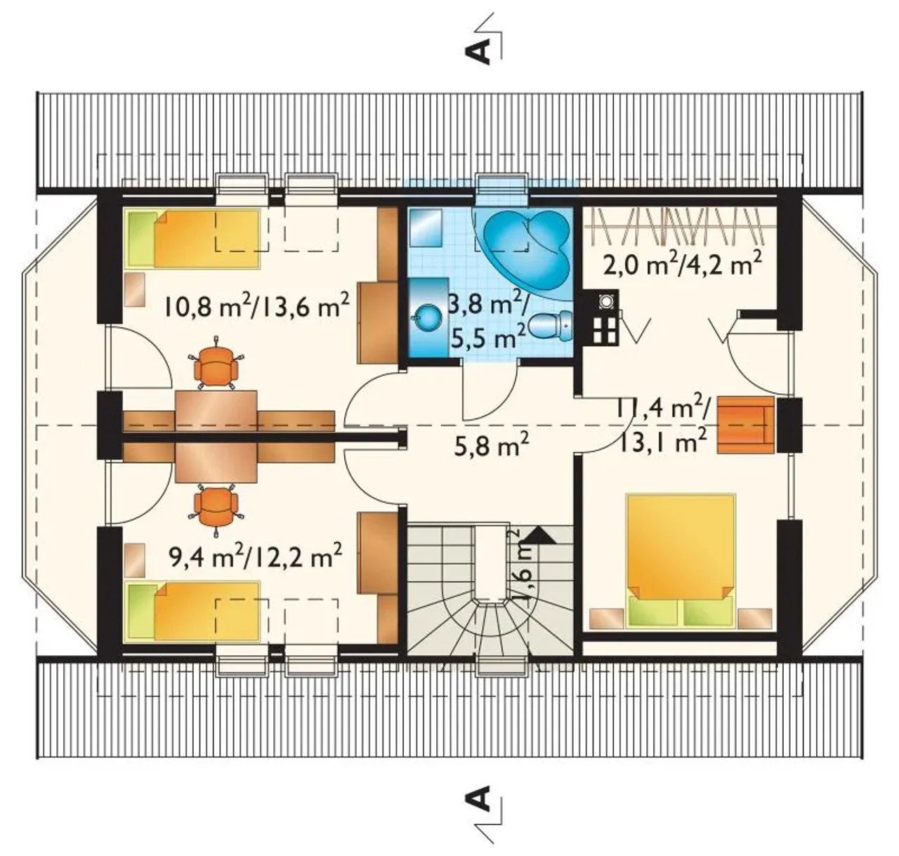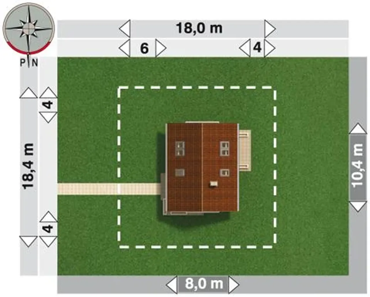 - rzut dachu - ukazuje jego kształt, wymiary, kąt nachylenia połaci, rozmieszczenie okien połaciowych, lukarn, świetlików i rur spustowych, pokazuje rozmieszczenie kominów i informuje o sposobie odwodnienia: rozmieszczeniu i rozmiarach rynien