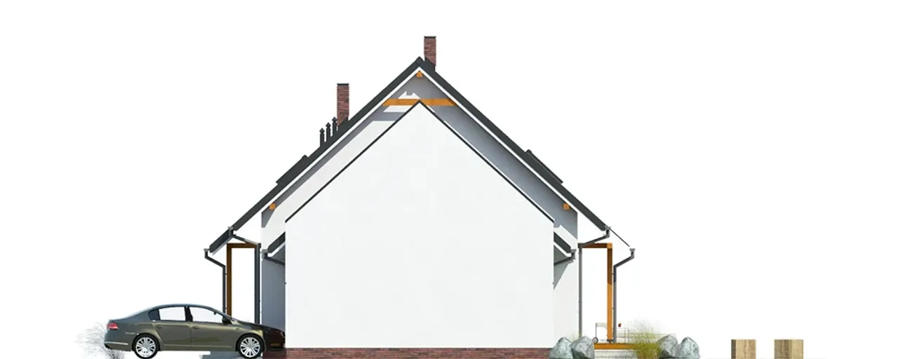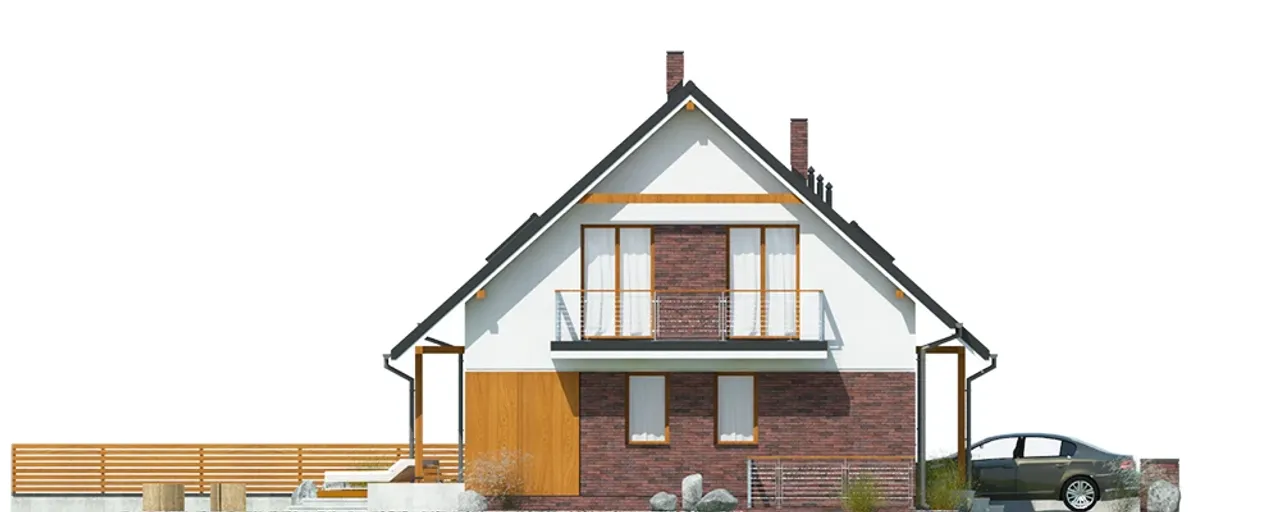Praktyczna pralnia ułatwia codzienną organizację domu, a wygodny, żelbetowy dwubiegowy schody prowadzą na poddasze. Ścianka kolankowa o wysokości 132cm nad garażem i 107cm nad częścią mieszkalną umożliwia efektywne wykorzystanie przestrzeni. Drewniana konstrukcja dachu przykryta dachówką ceramiczną nie tylko prezentuje się nowocześnie, ale także chroni dom przed działaniem czynników atmosferycznych.