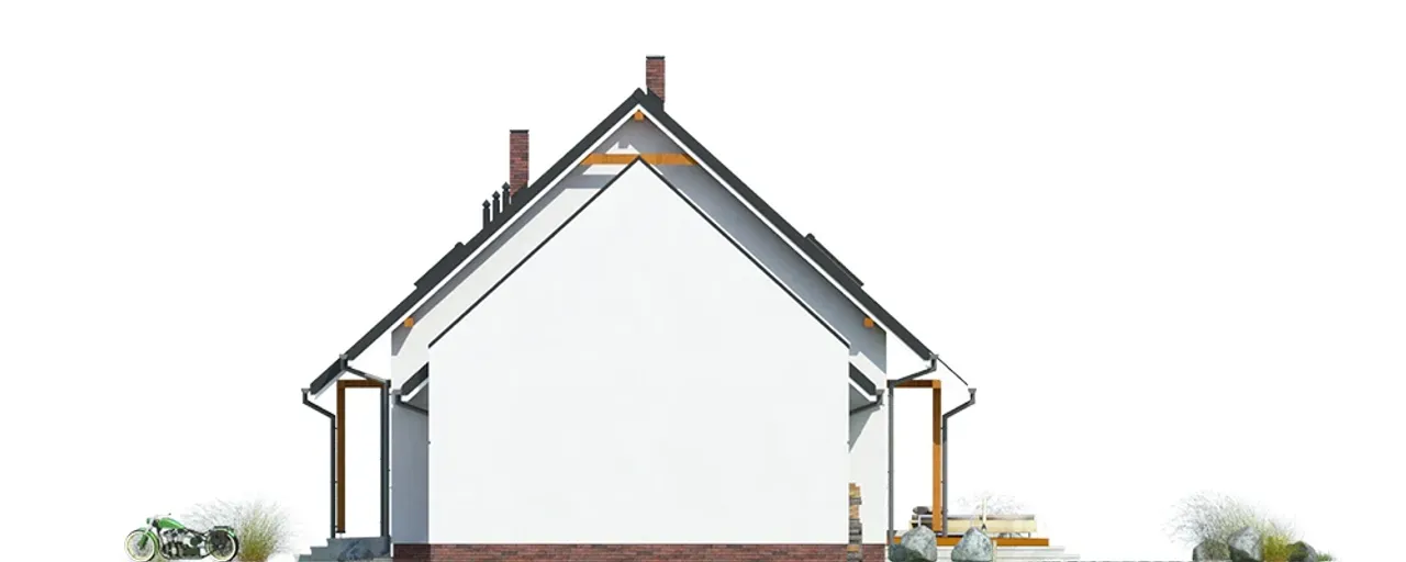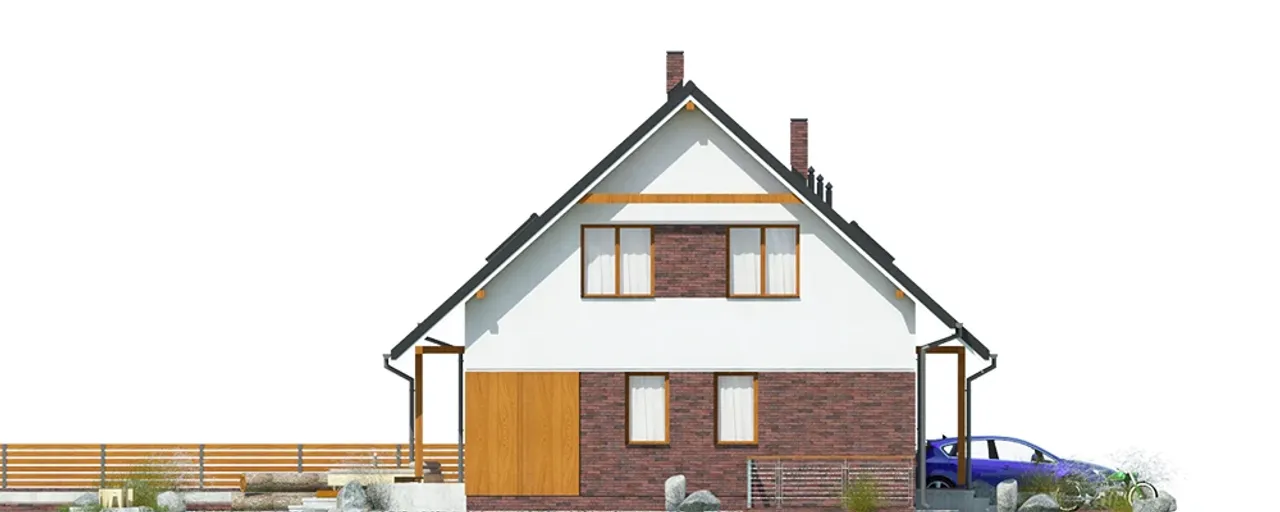 Wytrzymałe materiały - pustak ceramiczny firmy LEIER, ocieplenie styropianem Termo Organika i tynk - skutecznie izolują termicznie i akustycznie. Dach oparto na solidnej drewnianej konstrukcji z pokryciem dachówki ceramicznej, co przekłada się na trwałość i atrakcyjny wygląd. Kominek w projekcie stanowi dodatkowy atut na chłodne wieczory. Projekt przewiduje żelbetowe schody i stropy, rolę pokoi dopełniają duże okna i segmentowa brama garażowa.
