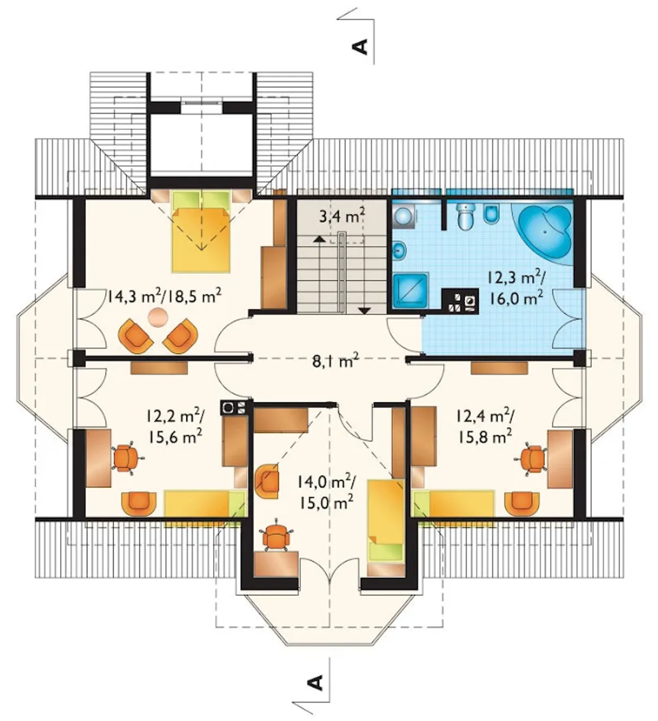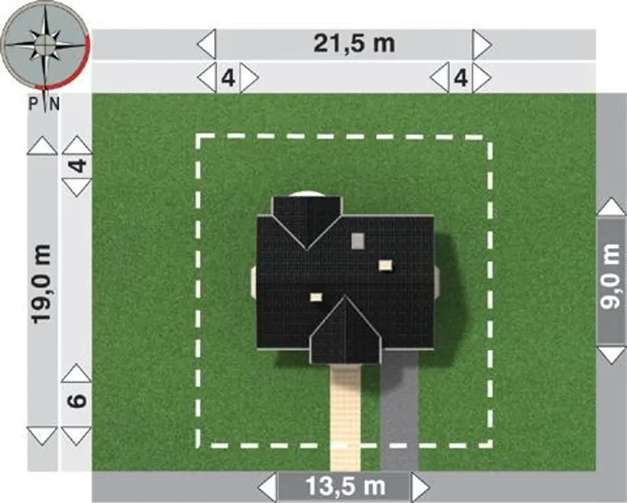- rzut dachu - ukazuje jego kształt, wymiary, kąt nachylenia połaci, rozmieszczenie okien połaciowych, lukarn, świetlików i rur spustowych, pokazuje rozmieszczenie kominów i informuje o sposobie odwodnienia: rozmieszczeniu i rozmiarach rynien