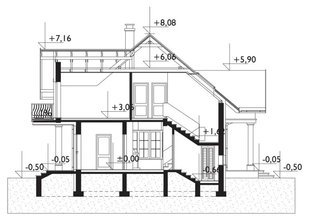 - przekroje - pokazują wszystkie elementy budynku po przecięciu go wzdłuż lub w poprzek od dachu do fundamentów tj. warstwy podłogi, stropów i dachu