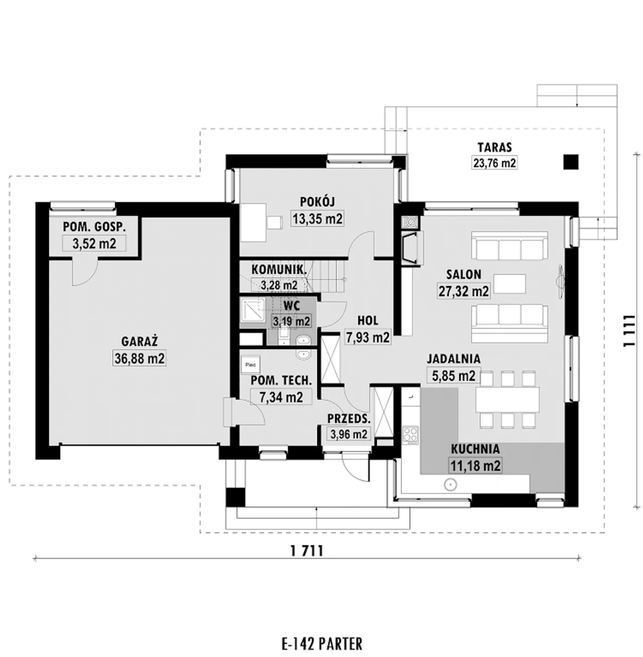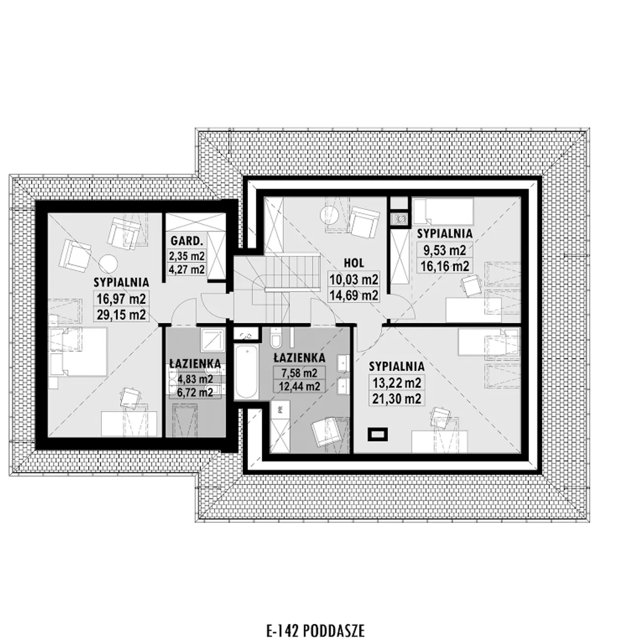 Wypełnij formularz i otrzymaj rysunki w pdf z dokładnymi wymiarami budynku i pomieszczeń (długość, szerokość, wysokość) dla projektu E-142