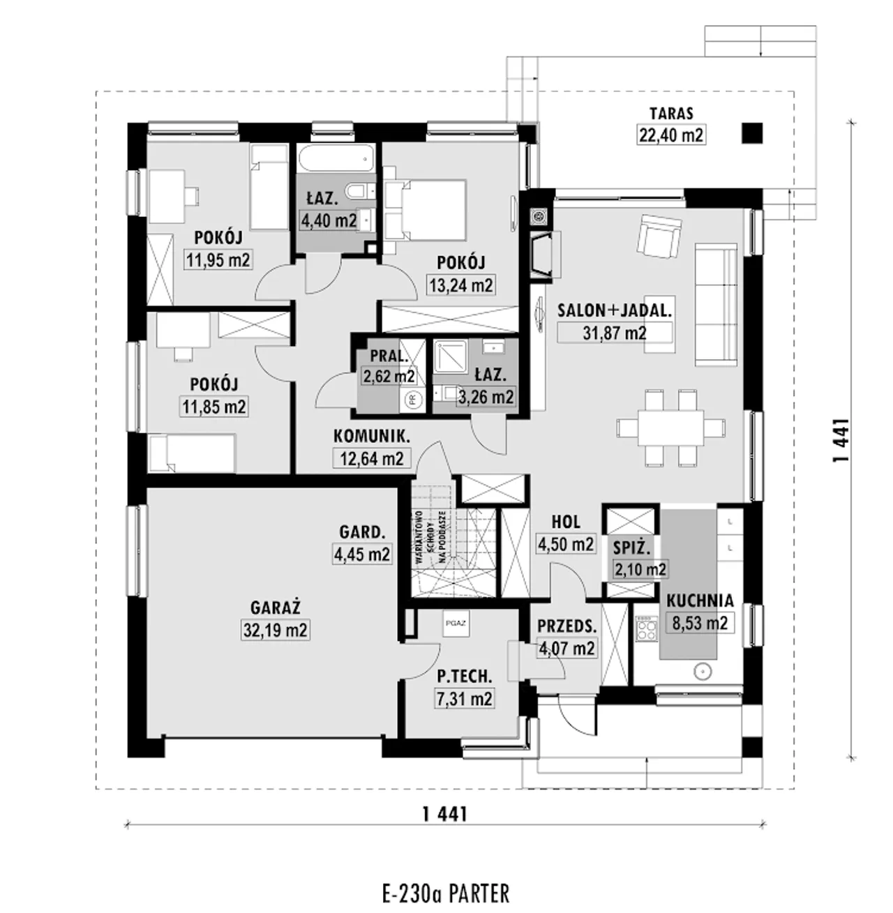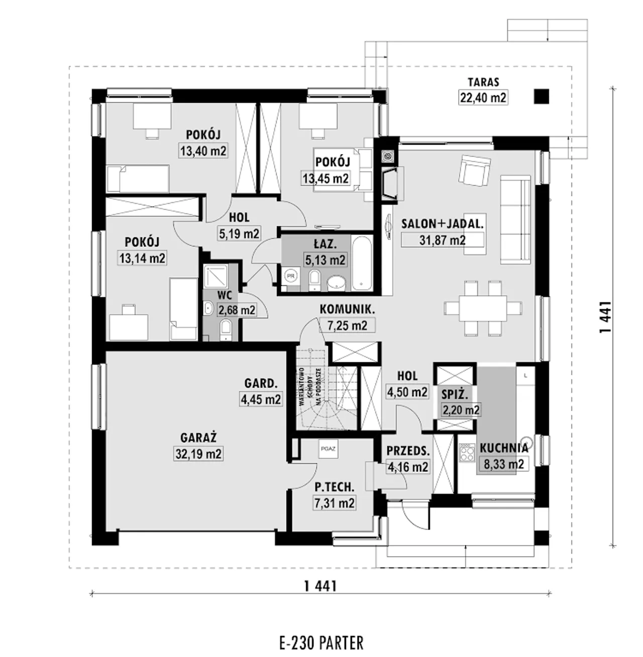Wypełnij formularz i otrzymaj rysunki w pdf z dokładnymi wymiarami budynku i pomieszczeń (długość, szerokość, wysokość) dla projektu E-230a