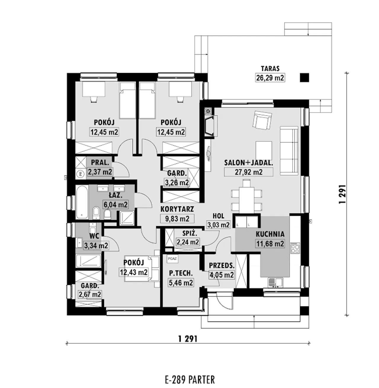 Projekt domu E-289 to prawdziwa perła wśród nowoczesnych domów jednorodzinnych, idealna dla każdej rodziny pragnącej cieszyć się wspólnymi chwilami w komfortowych warunkach. To dom z duszą, którego architektura łączy elegancję z funkcjonalnością. Przestronne, świetliste wnętrza sprawiają, że dom staje się nie tylko miejscem mieszkalnym, ale prawdziwym azylem. Ciekawie zaprojektowane przeszklenia umożliwiają idealne połączenie z naturą, co znacząco wpływa na komfort życia, a subtelne linie architektoniczne budynku wzbudzają podziw każdego, kto przechodzi obok. To miejsce, gdzie każdy dzień może być kameralnym celebrowaniem rodzinnych momentów.