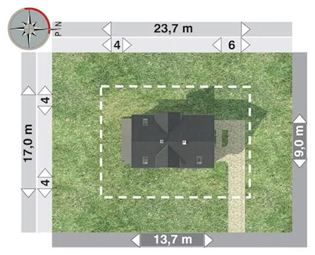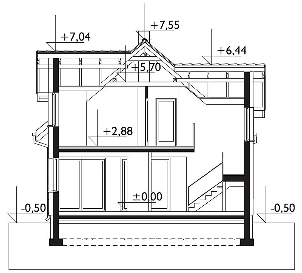- rzut dachu - ukazuje jego kształt, wymiary, kąt nachylenia połaci, rozmieszczenie okien połaciowych, lukarn, świetlików i rur spustowych, pokazuje rozmieszczenie kominów i informuje o sposobie odwodnienia: rozmieszczeniu i rozmiarach rynien