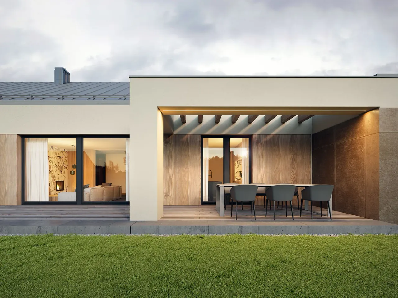 Poznaj projekt przemyślany w każdym detalu — przestronny, solidnie wykonany, przygotowany do codziennego życia, odpoczynku na tarasie i praktycznego przechowywania. Maksymalnie funkcjonalna strefa dzienna z kominkiem, duża kotłownia i spiżarnia to rozwiązania, które wyróżniają tę inwestycję na tle innych domów parterowych.