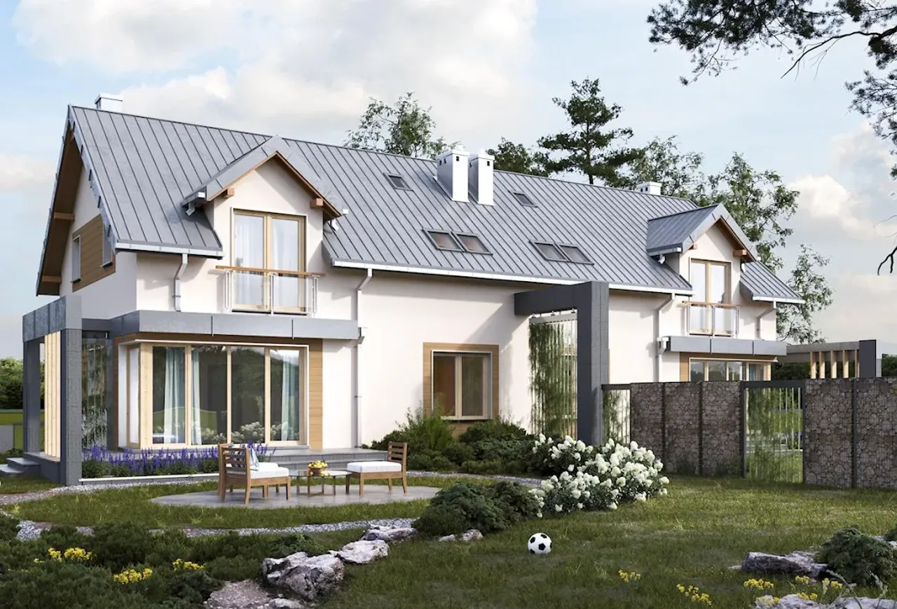 parterowy+poddasze Design tego domu ma niewątpliwy urok, przywodzący na myśl spokojne życie w zrównoważeniu z naturą. Wizualna prezentacja wskazuje na przemyślane rozwiązania architektoniczne.