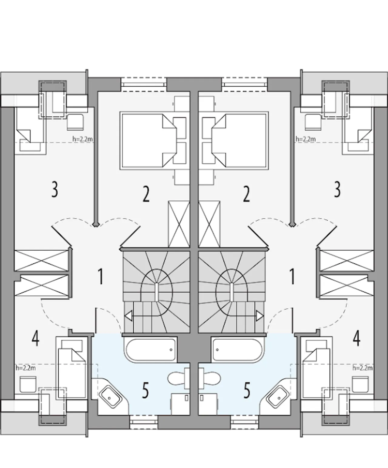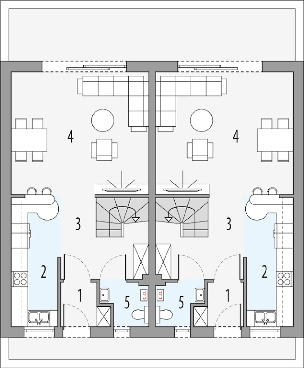 Wypełnij formularz i otrzymaj rysunki w pdf z dokładnymi wymiarami budynku i pomieszczeń (długość, szerokość, wysokość) dla projektu Emilka 2 - dwulokalowy PLP