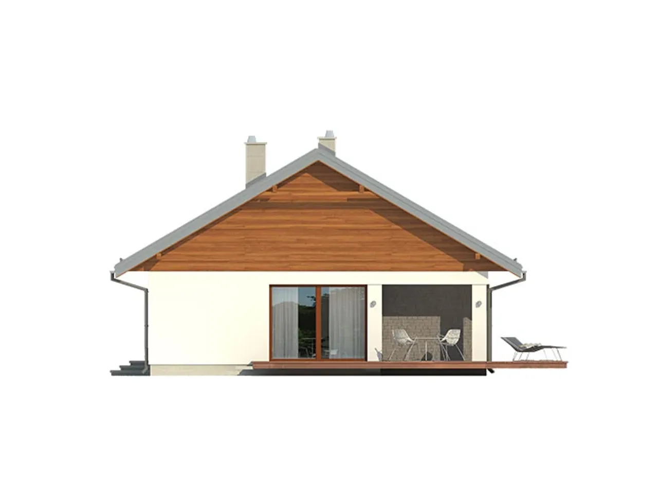 Projekt Endo drewniany wykorzystuje nowoczesną technologię szkieletową, gwarantując wytrzymałość, elastyczność oraz naturalną estetykę. Prosta, jednokondygnacyjna bryła ułatwia komunikację między pomieszczeniami i pozwala na optymalne doświetlenie wnętrz. Czteroskrzydłowy układ funkcjonalny przewiduje zarówno wygodne pokoje, jak i doskonale zaprojektowaną strefę wspólną - przestronny salon z kominkiem otwiera się na taras, a kuchnia z praktyczną spiżarnią ułatwia codzienne przygotowywanie posiłków.
