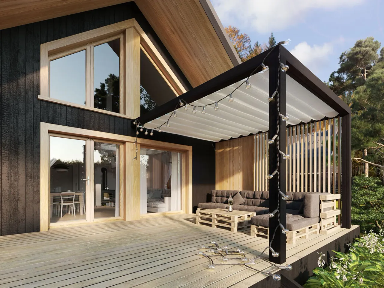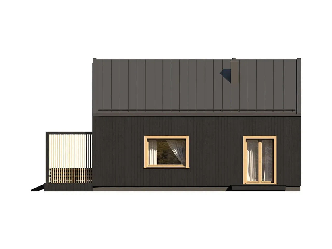 Dom zaprojektowano jako budynek z prostą, elegancką bryłą, która doskonale wpisuje się w nowoczesne trendy architektoniczne. Stonowana elewacja z naturalnej, drewnianej szalówki podkreśla połączenie z otoczeniem, a dwuspadowy dach nadaje bryle lekkości i pozwala na efektywne odprowadzanie wody. Dach pokryty trwałą dachówką lub blachodachówką gwarantuje niezawodność przez dziesięciolecia.