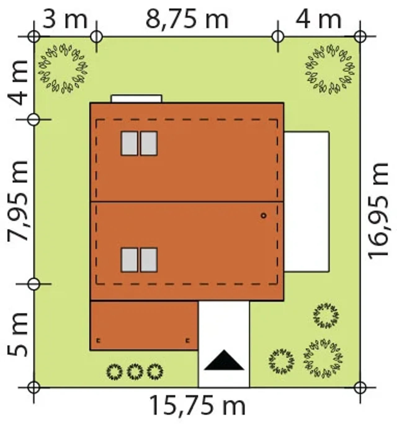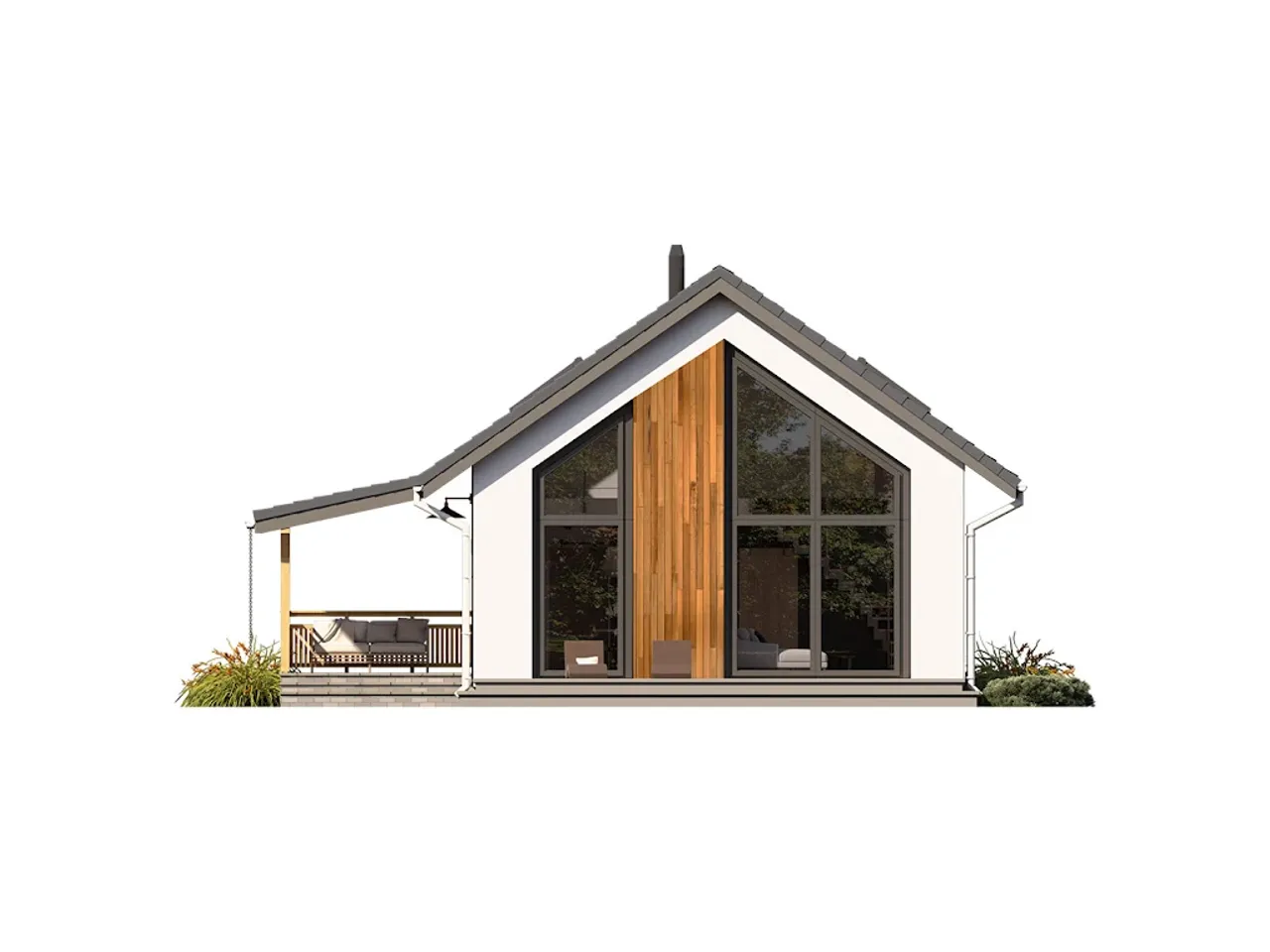 Dom wybudowany na podstawie projektu Erna 3 wyróżnia się nowoczesnym stylem, elegancką formą dwuspadowego dachu i optymalnym wykorzystaniem powierzchni. Kalenica równoległa do drogi sprzyja ustawnemu ulokowaniu domu na działce, a brak piwnicy przekłada się na niższe koszty budowy. Całoroczny charakter domu gwarantuje komfort przez wszystkie sezony - murowane ściany wewnętrzne budują poczucie solidności i ciszy we wnętrzach.