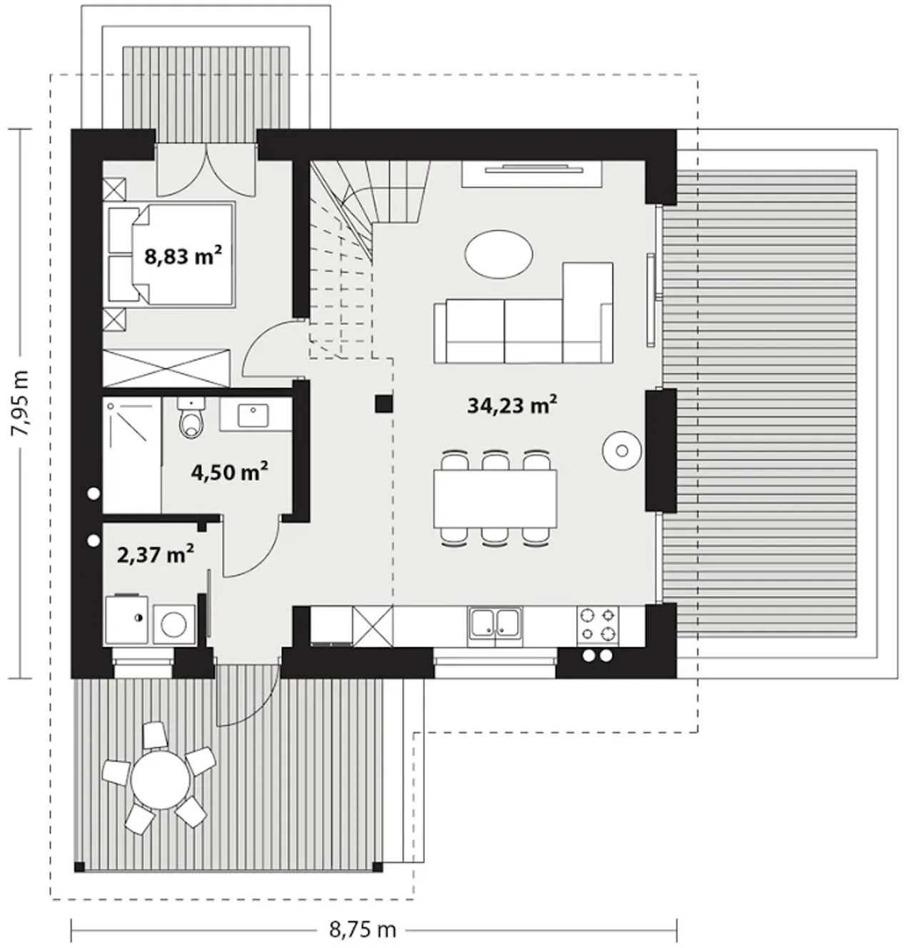 Projekt Erna 3 na pierwszy rzut oka wyróżnia się nowoczesnym designem, który idealnie wpasowuje się w aktualne trendy architektoniczne. Estetyka budynku łączy w sobie elegancję z funkcjonalnością, co z pewnością przypadnie do gustu osobom ceniącym sobie przestronność i praktyczne rozwiązania. Duże przeszklenia zapewniają optymalne doświetlenie wnętrz, co tworzy przyjemną atmosferę w domu. Układ pomieszczeń został zaprojektowany tak, aby zapewnić maksymalną wygodę użytkowania dla wszystkich domowników. Ciekawym elementem jest także przestronna strefa dzienna, która sprzyja rodzinnym spotkaniom. Dach budynku podkreśla nowoczesny charakter projektu, a zarazem jest praktyczny, co może być ważnym atutem dla wielu inwestorów.