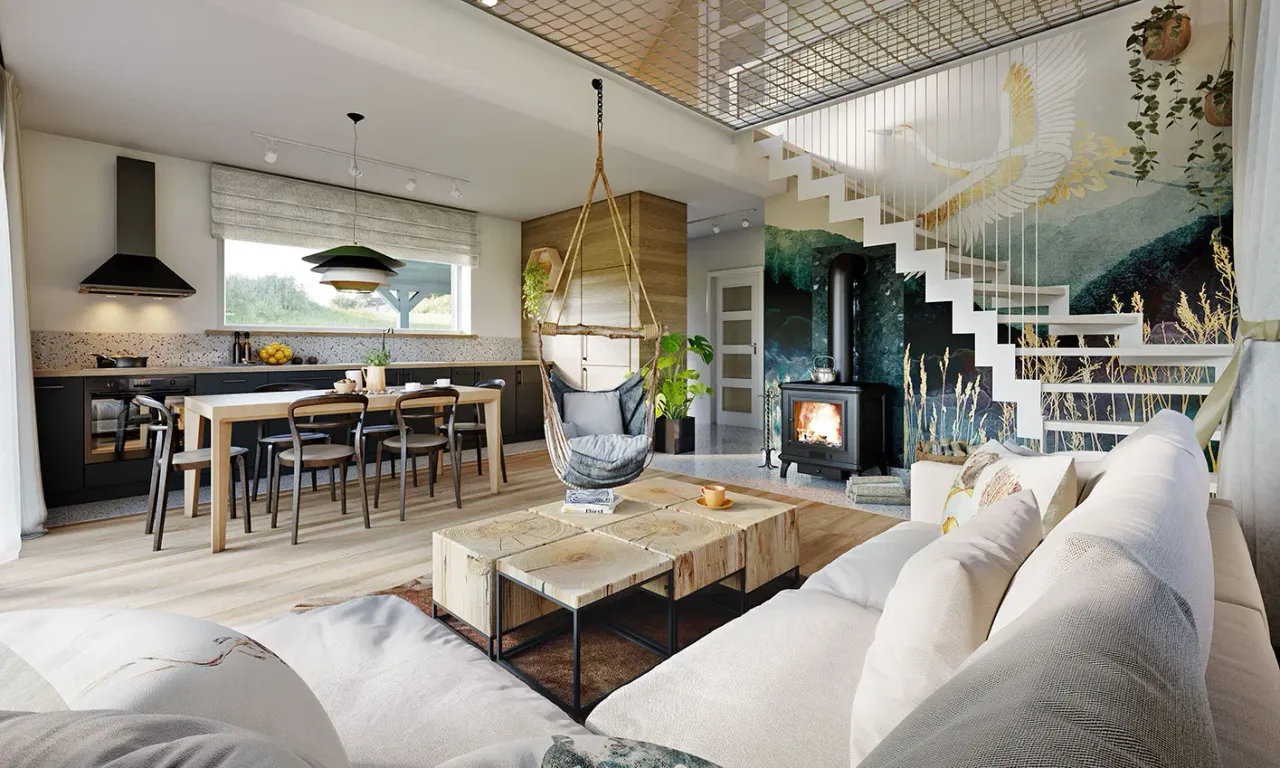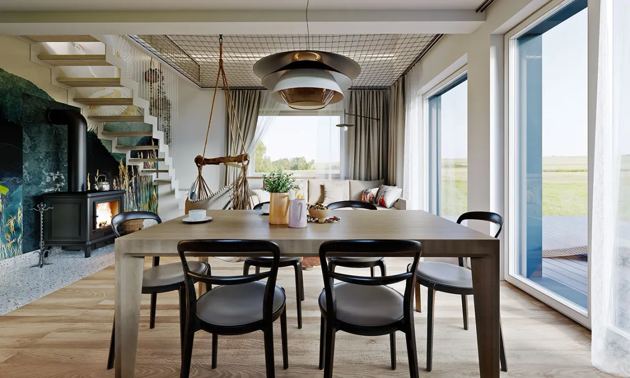 Energooszczędność to mocna strona projektu - zastosowanie pompy ciepła oraz ogrzewania podłogowego podnosi komfort codziennych czynności, jednocześnie pozwala zredukować koszty utrzymania. Kominek w salonie tworzy przytulną atmosferę w chłodniejsze wieczory, a strategiczne rozmieszczenie pomieszczeń sprzyja wygodnej organizacji życia domowego.