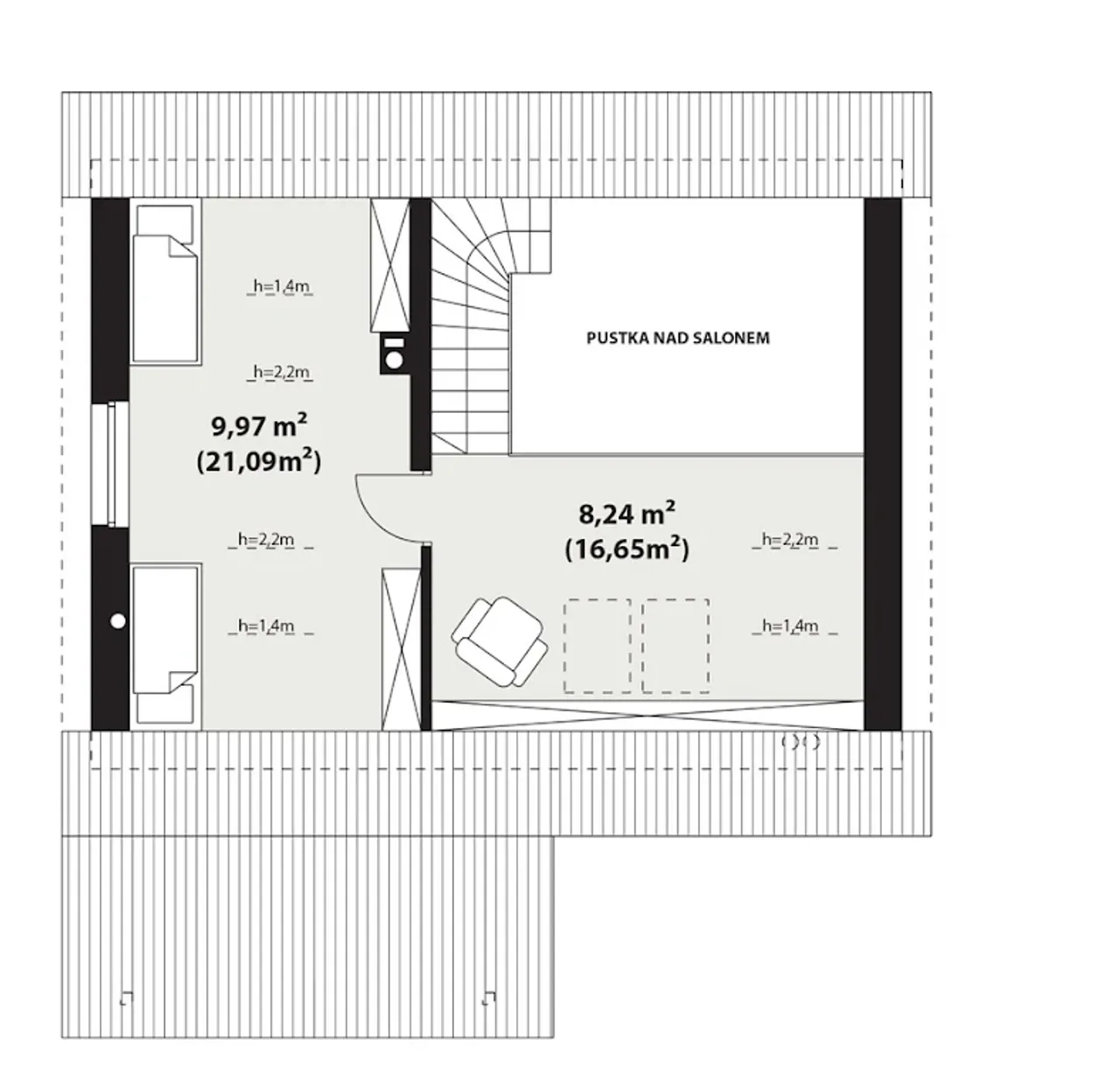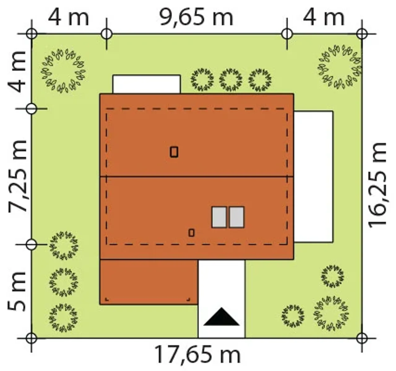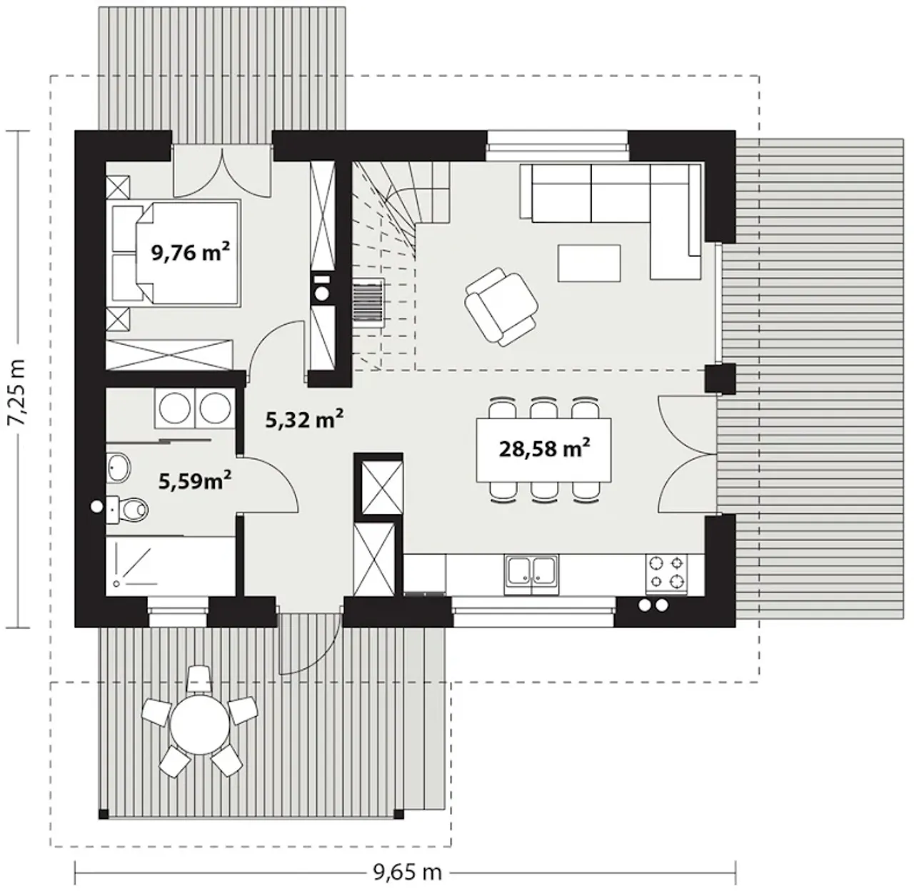 Nowoczesny dach dwuspadowy możesz wykończyć dachówką lub blachodachówką, dostosowując wygląd do otoczenia. Stylowa płytka elewacyjna zabezpiecza ściany i podkreśla minimalistyczną linię domu. Brak garażu otwiera możliwości dowolnej organizacji przestrzeni obok domu - możesz wykorzystać ten teren na ogród lub taras.