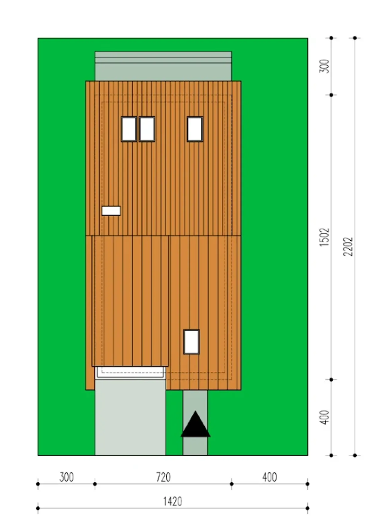 4. Rzut dachu – dokładnie zwymiarowany pokazujący kształt dachu i jego kąt nachylenia ,rozmieszczenie okien połaciowych, lukarn oraz rur spustowych.