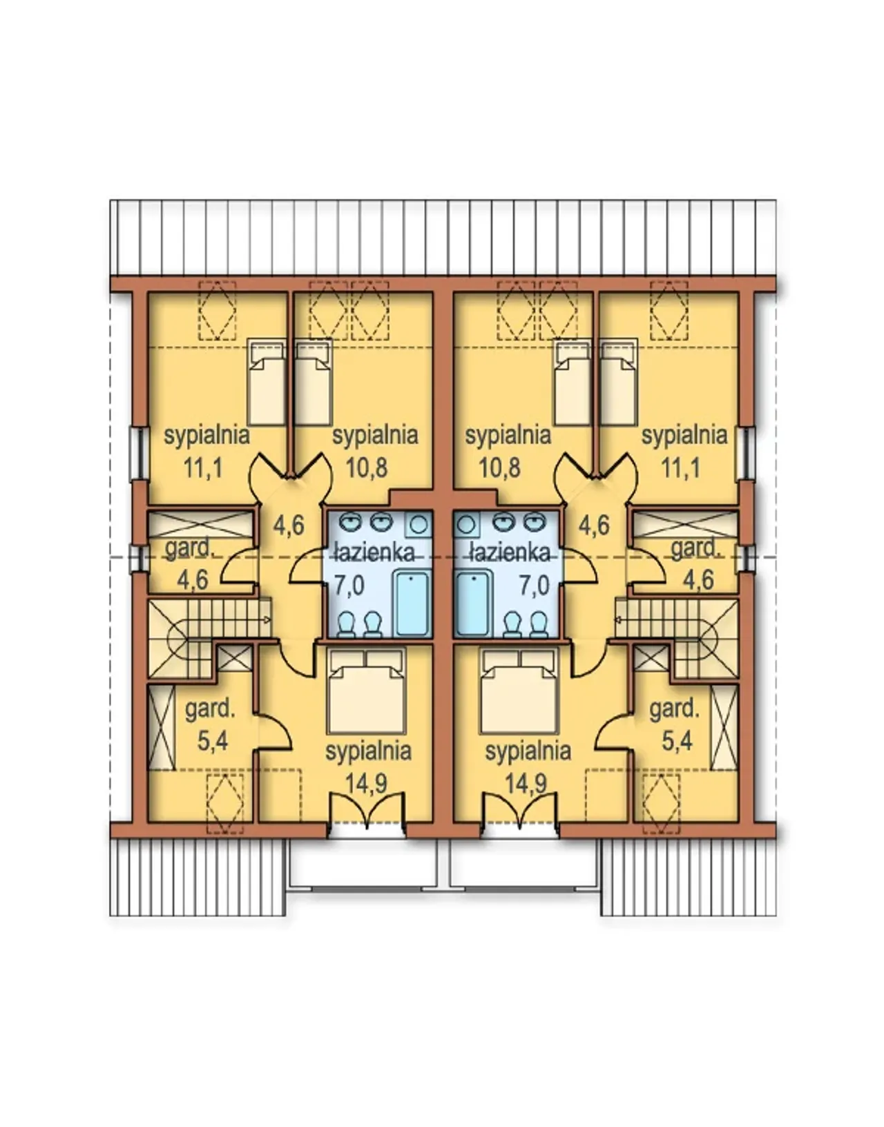 4. Rzut dachu – dokładnie zwymiarowany pokazujący kształt dachu i jego kąt nachylenia ,rozmieszczenie okien połaciowych, lukarn oraz rur spustowych.