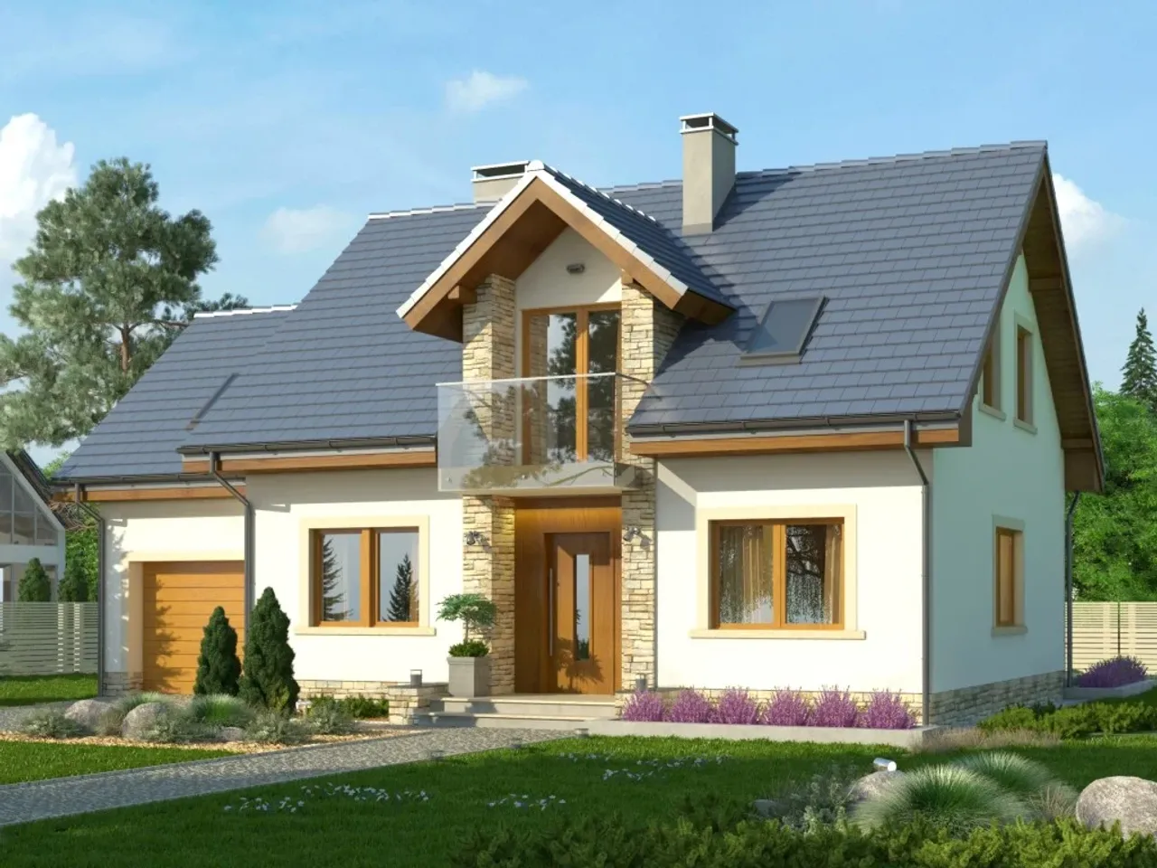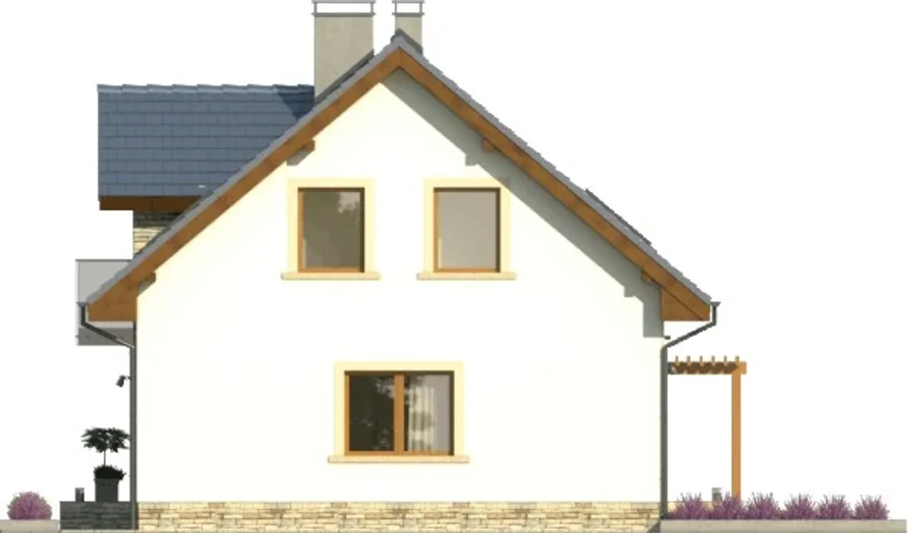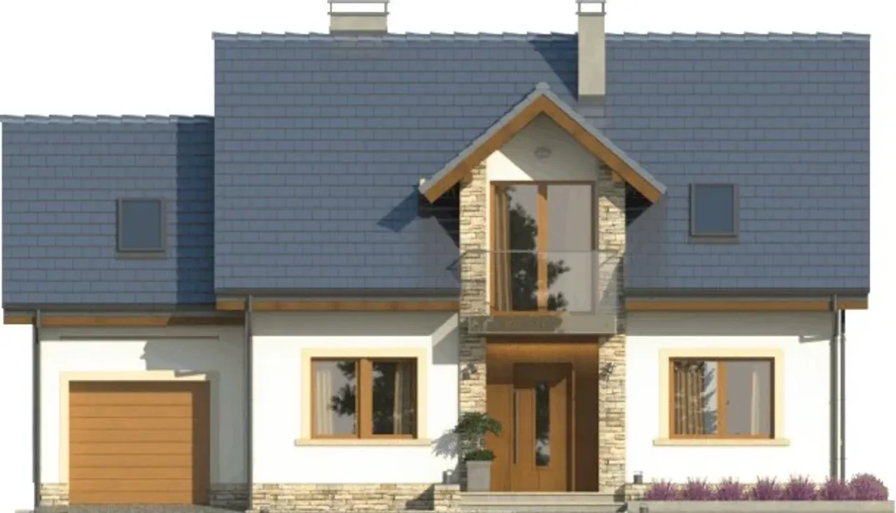 Gotowy projekt ESTYMA_2 to budynek piętrowy o prostej bryle w technologii murowanej. Budynek zaprojektowany został w stylu tradycyjnym z dachem dwuspadowym. W projekcie nie przewidziano podpiwniczenia. Do budynku przynależy garaż 1 stanowiskowy. W projekcie zaplanowano pomieszczenie na garderobę. Projekt nie przewiduje spiżarni. W przestronnym salonie znajduje się kominek.