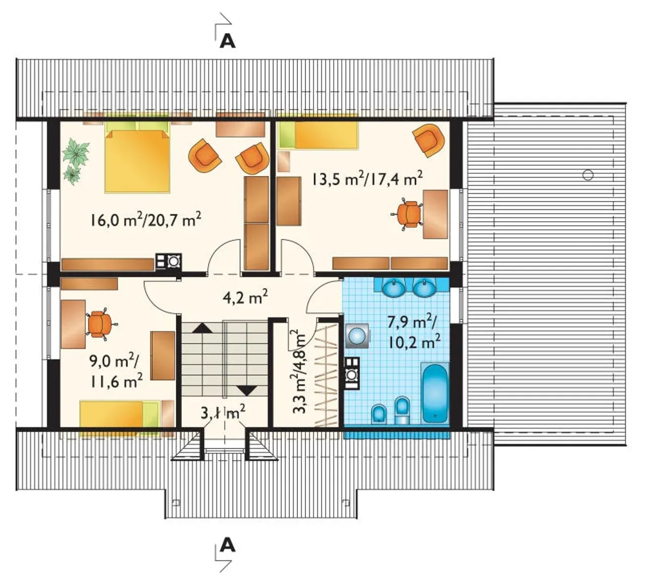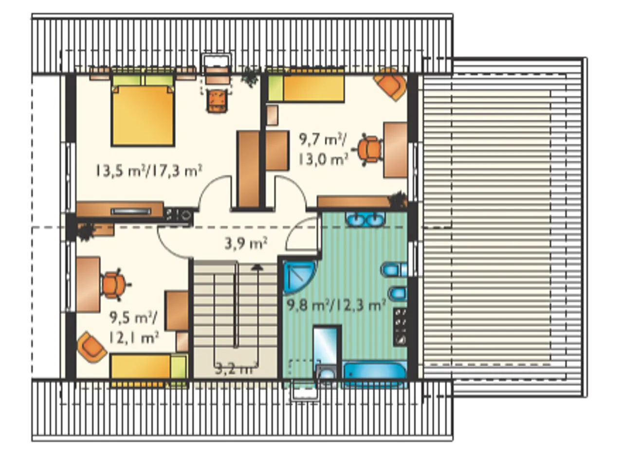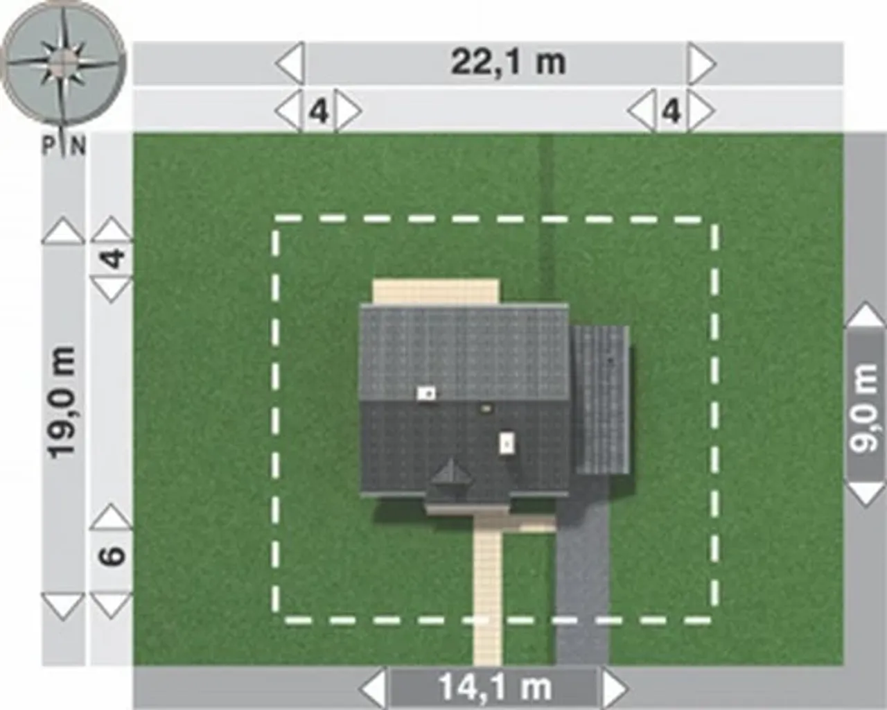 - rzut dachu - ukazuje jego kształt, wymiary, kąt nachylenia połaci, rozmieszczenie okien połaciowych, lukarn, świetlików i rur spustowych, pokazuje rozmieszczenie kominów i informuje o sposobie odwodnienia: rozmieszczeniu i rozmiarach rynien