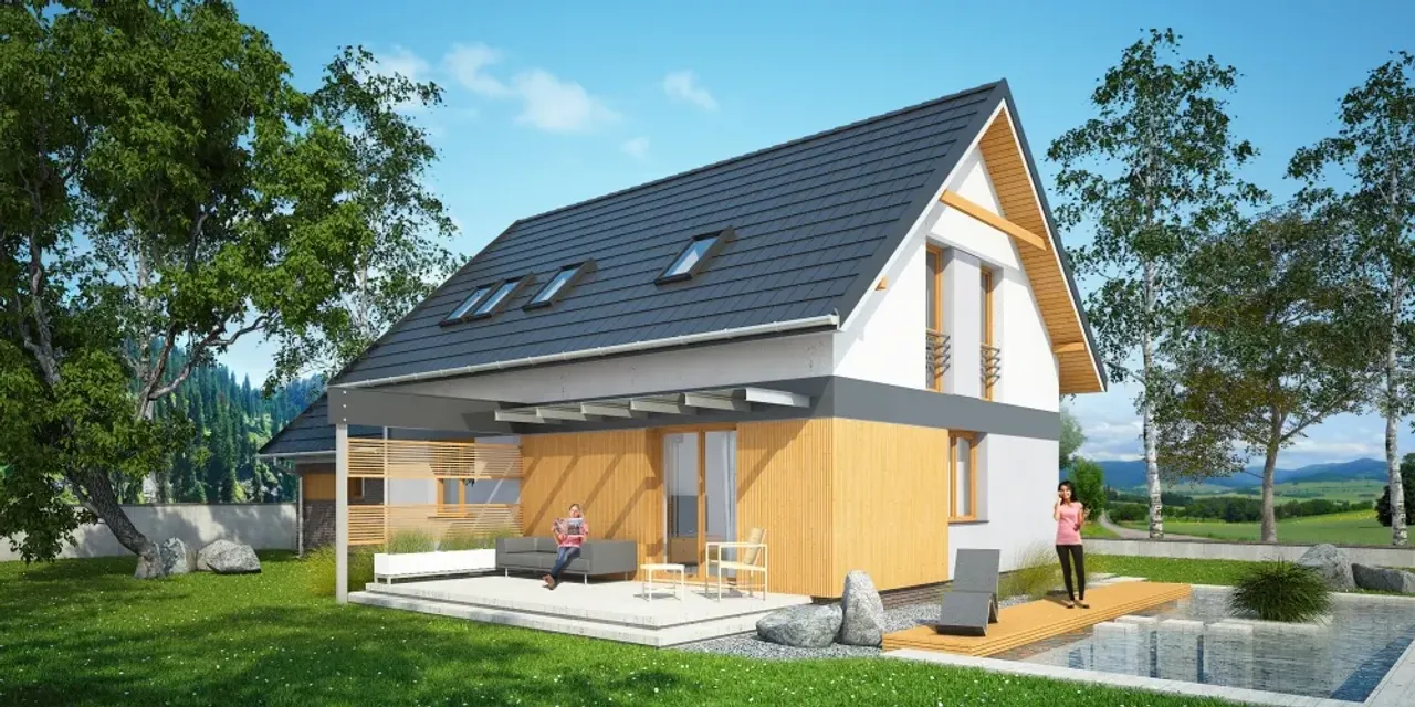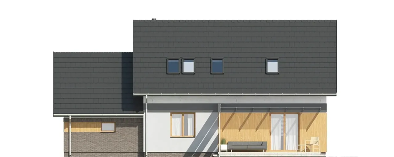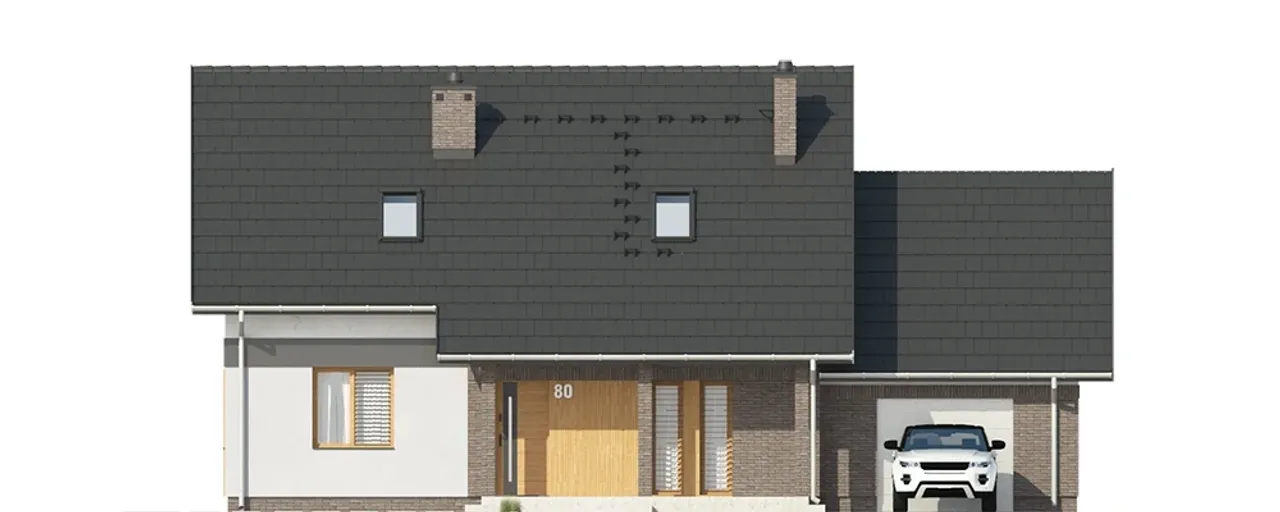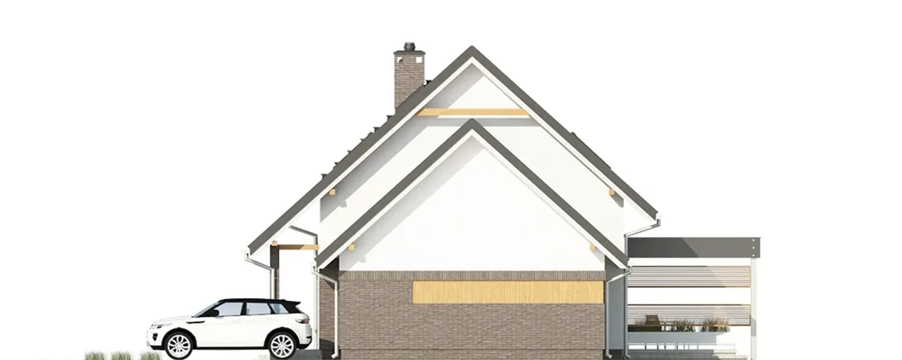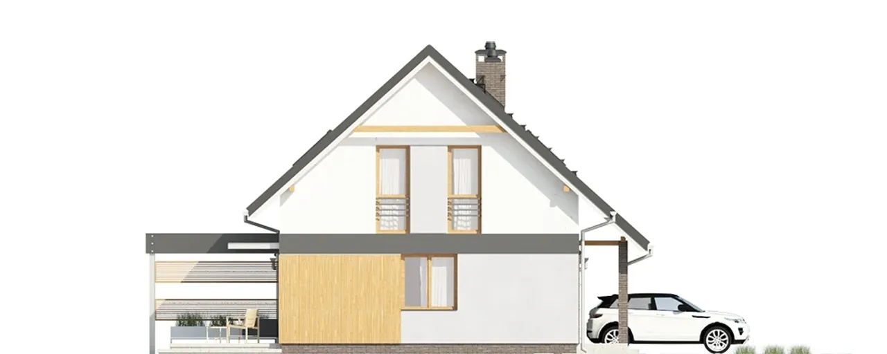 Dwuspadowy dach o kącie nachylenia 42° nie tylko wyróżnia się klasyczną estetyką, ale również sprzyja odprowadzaniu śniegu i deszczu. Pokrycie ceramiczną dachówką wpływa na długowieczność i odporność konstrukcji. Dzięki równoległej kalenicy dom będzie atrakcyjnie prezentować się od strony ulicy, stanowiąc wizytówkę właścicieli.