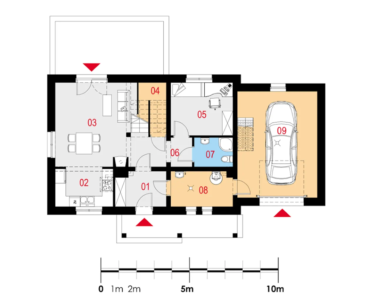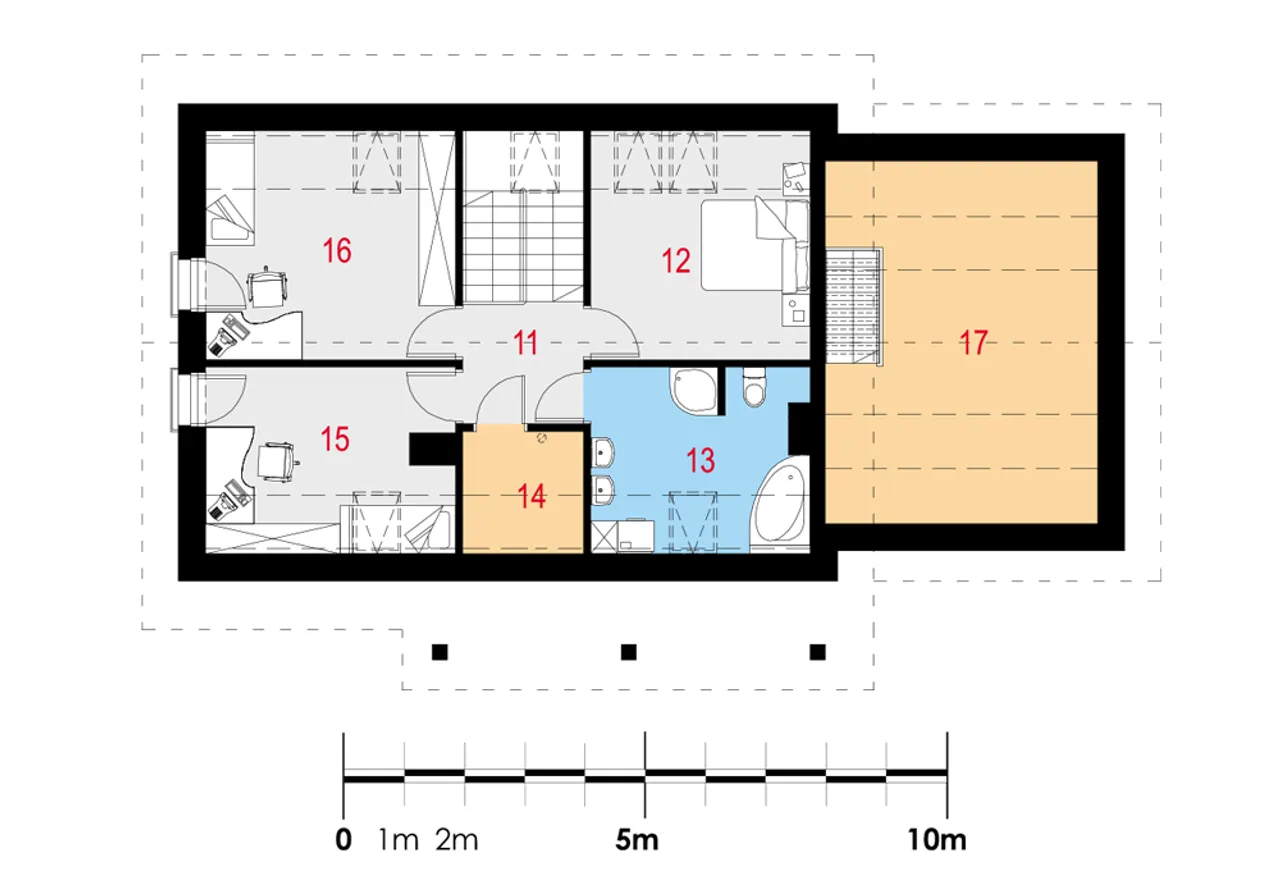 Na parterze przewidziano aż pięć wygodnych pokoi - to rozwiązanie dla rodzin szukających prywatności, ale i dużej wspólnej przestrzeni. Żelbetowe schody prowadzą na poddasze, gdzie wygospodarowano dodatkowe miejsce - praktyczny strych, który może zostać wykorzystany na przechowywanie lub własny warsztat. Technologia murowana oraz strop żelbetowy gwarantują stabilność i bezpieczeństwo na długie lata. Stolarka drzwiowa i okienna z PVC oraz rolety zewnętrzne pozwalają lepiej chronić domowników przed utratą energii i wpływem czynników zewnętrznych.