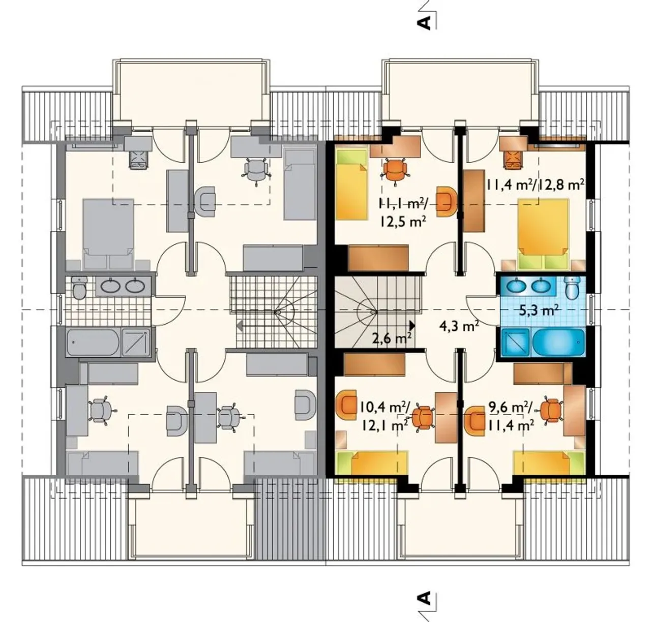 - rzuty wszystkich kondygnacji- pokazuje rozmieszczenie poszczególnych pomieszczeń i ich wymiary, powierzchnie, rozmieszczenie ścian, rozmieszczenie otworów drzwiowych, okiennych, urządzeń kuchennych i sanitarnych