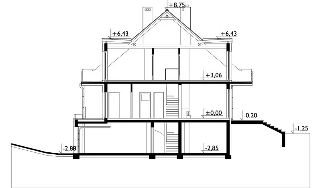 - przekroje - pokazują wszystkie elementy budynku po przecięciu go wzdłuż lub w poprzek od dachu do fundamentów tj. warstwy podłogi, stropów i dachu