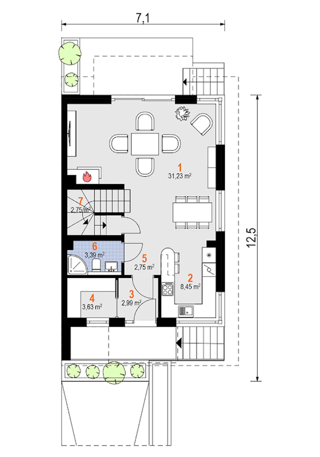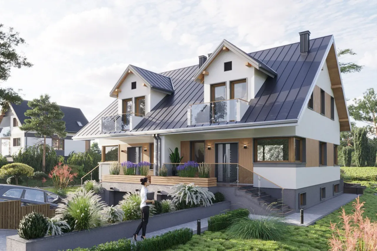 - elewacje - pokazują dokładny wygląd domu od frontu, z tyłu i z boków
