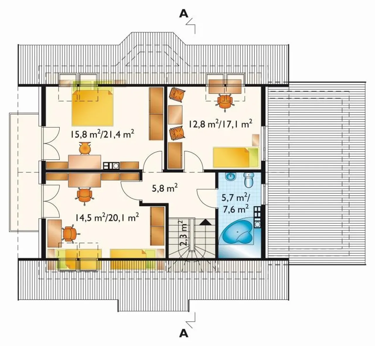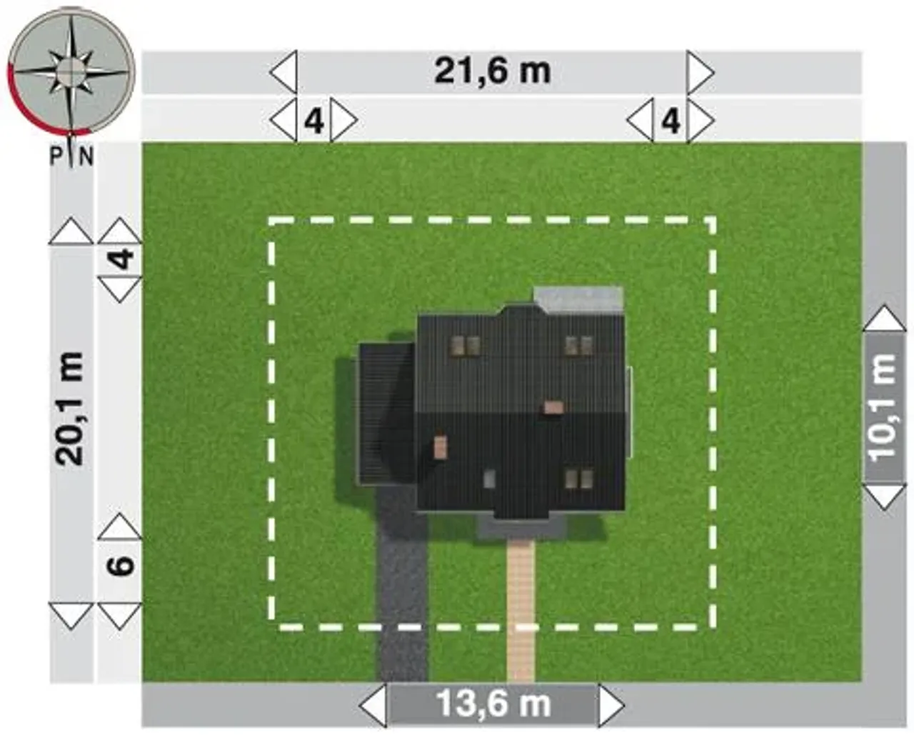 - rzut dachu - ukazuje jego kształt, wymiary, kąt nachylenia połaci, rozmieszczenie okien połaciowych, lukarn, świetlików i rur spustowych, pokazuje rozmieszczenie kominów i informuje o sposobie odwodnienia: rozmieszczeniu i rozmiarach rynien