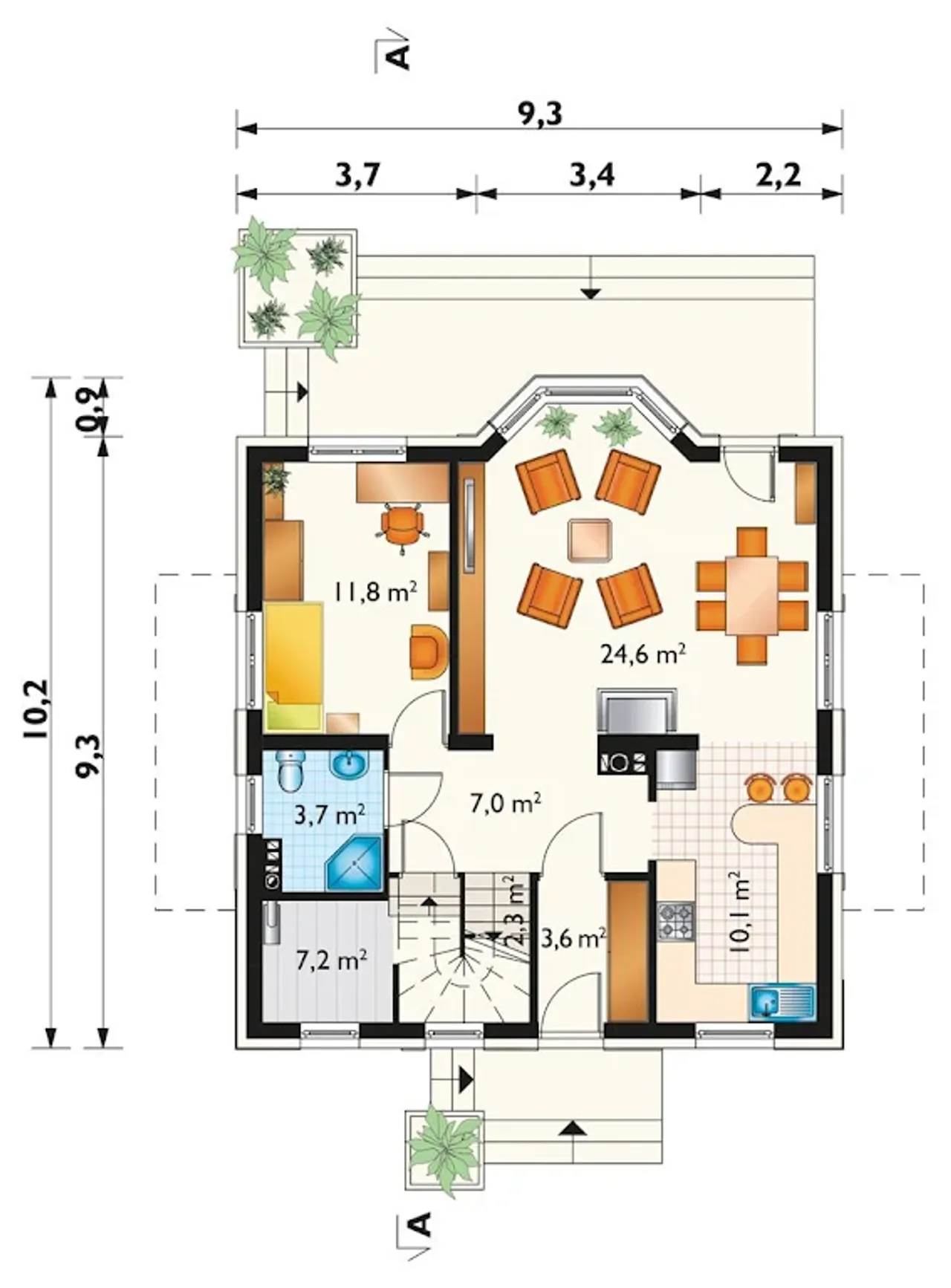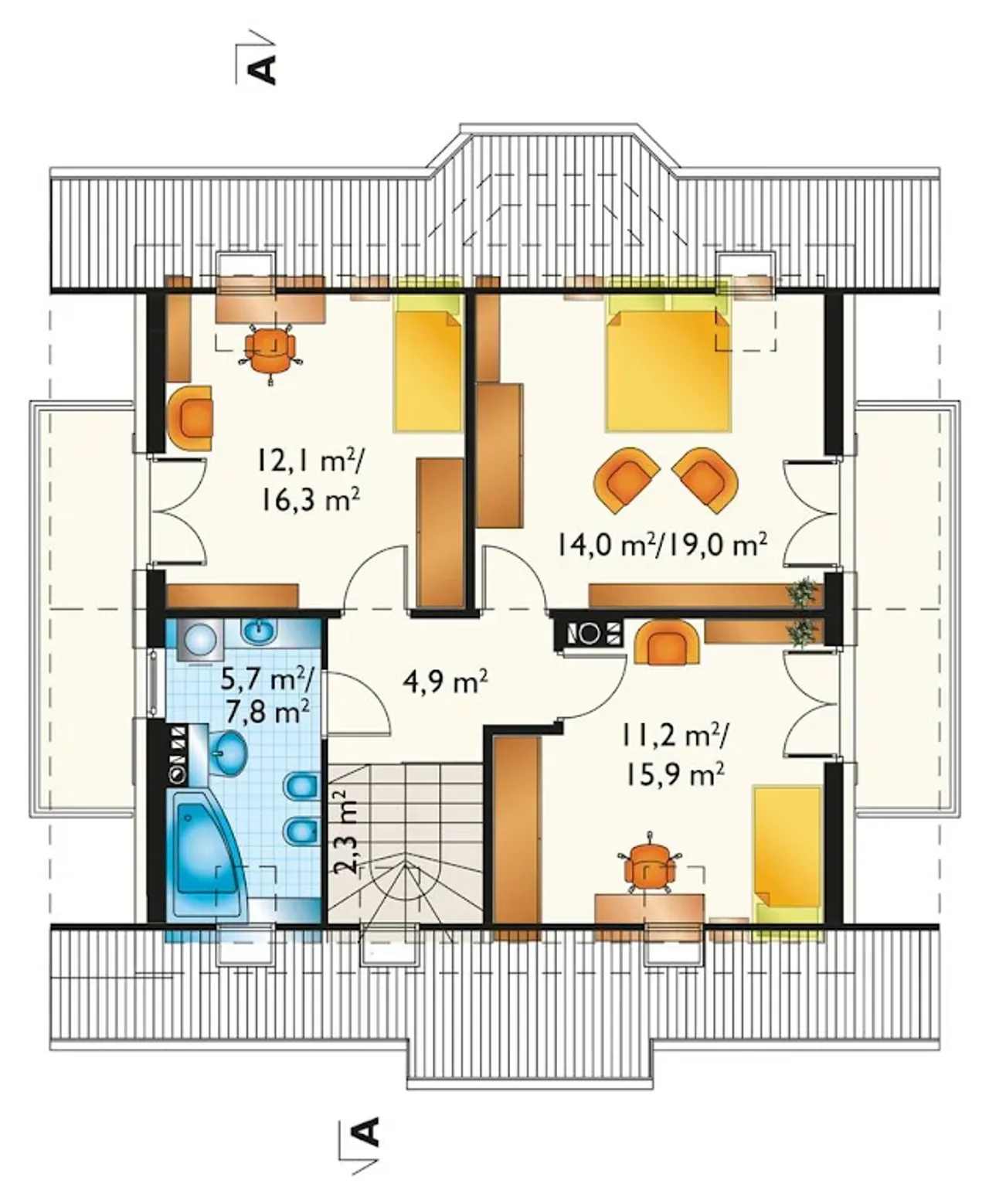 - elewacje - pokazują dokładny wygląd domu od frontu, z tyłu i z boków