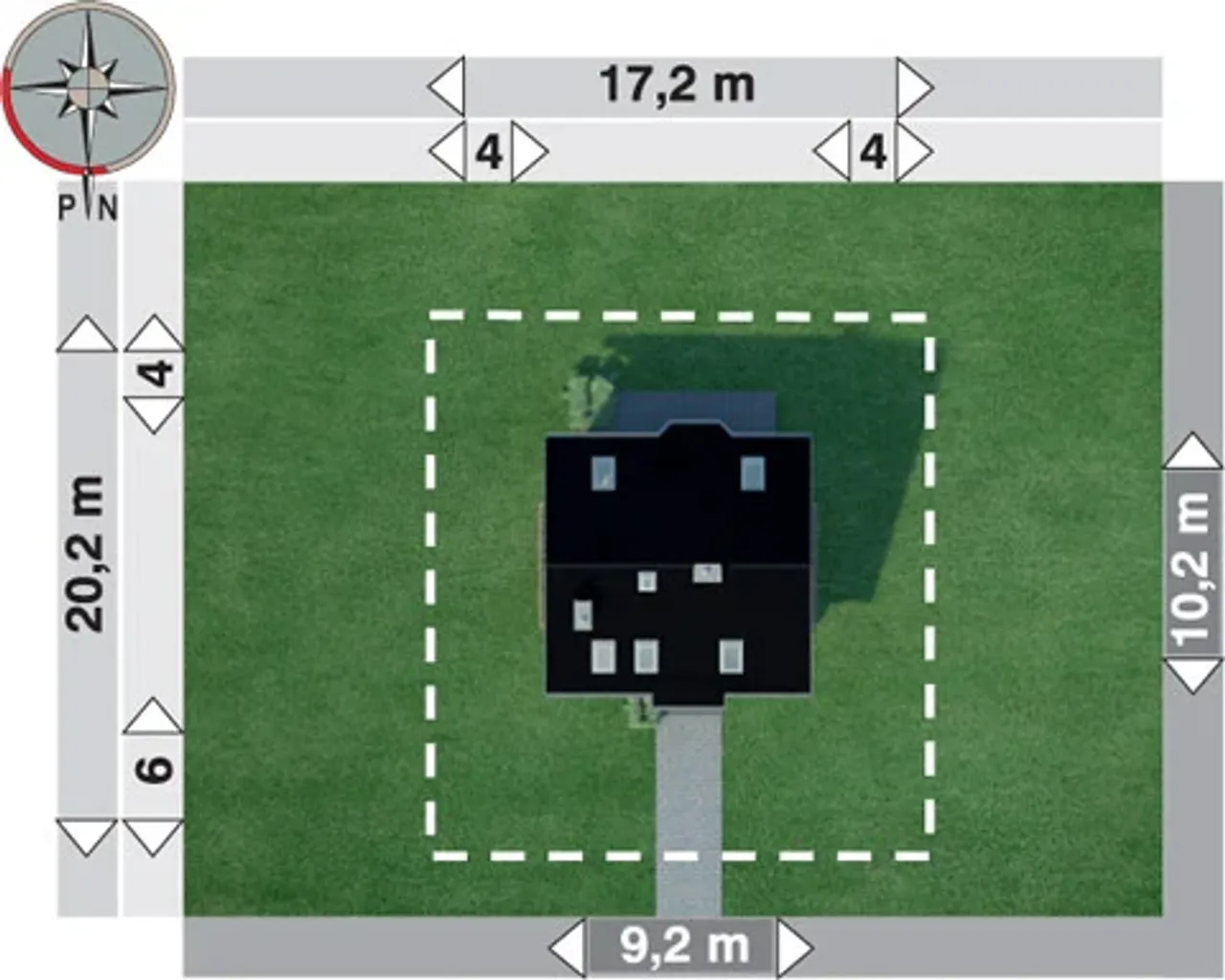 - rzut dachu - ukazuje jego kształt, wymiary, kąt nachylenia połaci, rozmieszczenie okien połaciowych, lukarn, świetlików i rur spustowych, pokazuje rozmieszczenie kominów i informuje o sposobie odwodnienia: rozmieszczeniu i rozmiarach rynien