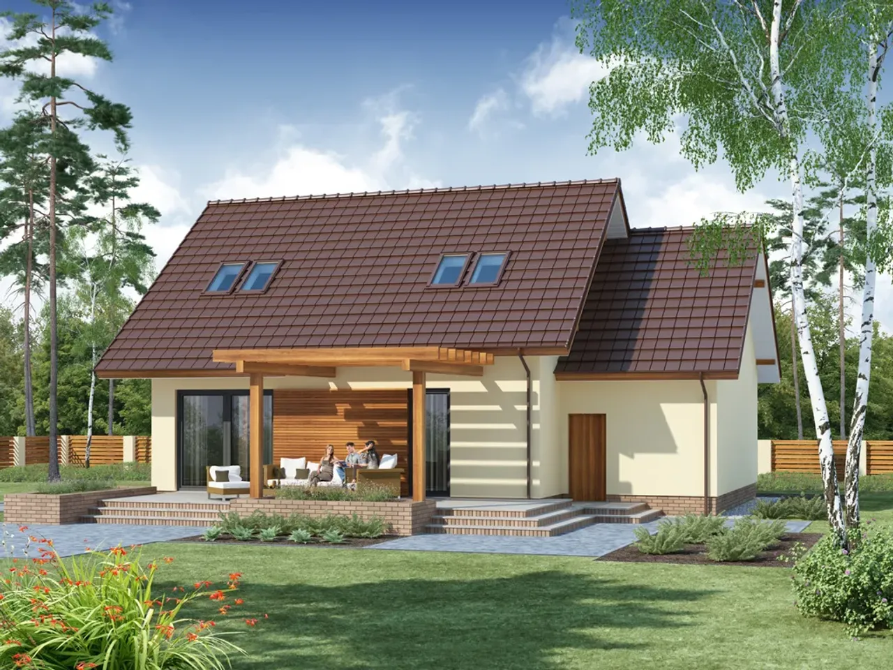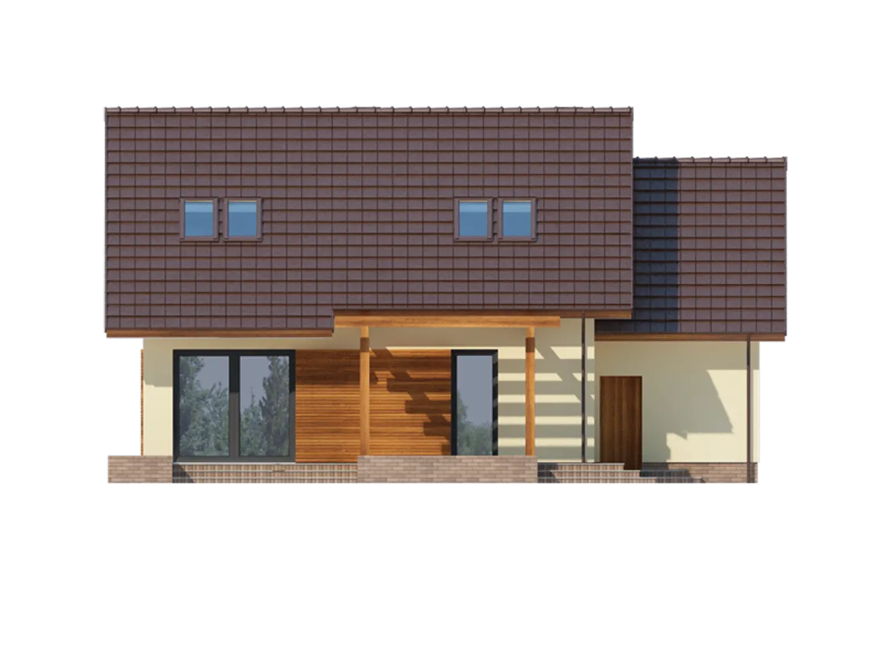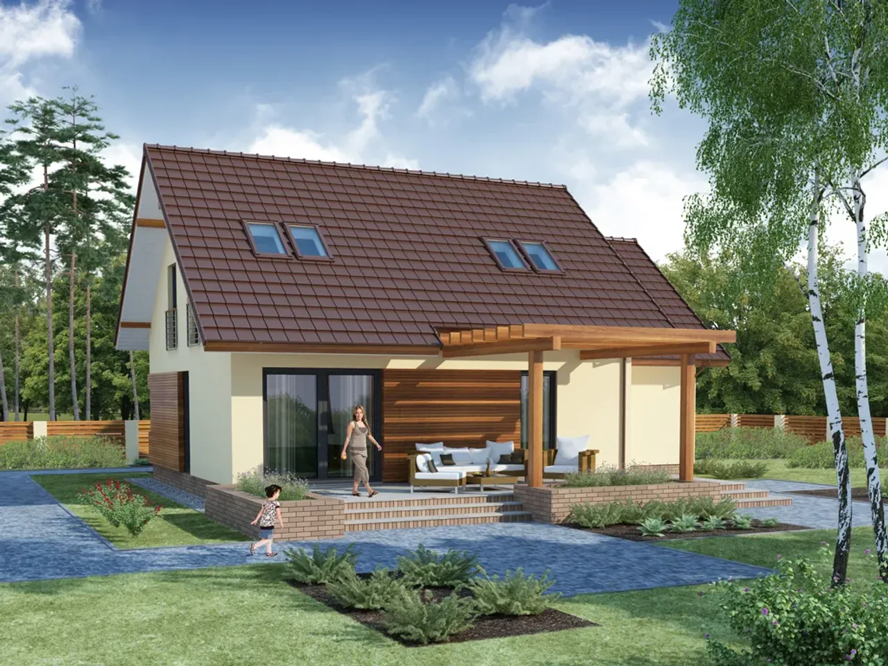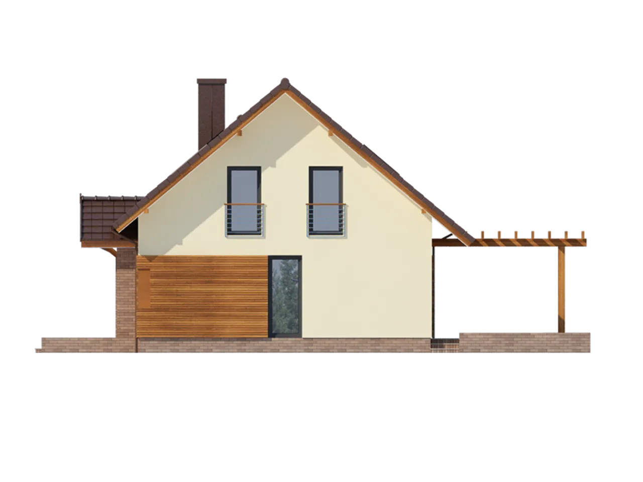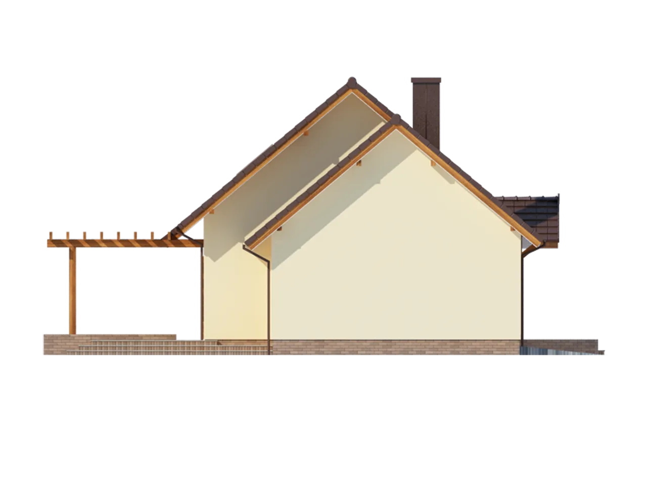 Projekt domu Filomena PS to parterowy dom z poddaszem pokryty dachem dwuspadowym. Budynek posiada prosty tradycyjny wygląd, od strony frontowej znajdują się zadaszone drzwi frontowe oraz wjazd do garażu jednostanowiskowego, z którego można dostać bezpośrednio do wnętrza. W projekcie domu Filomena PS od strony ogrodu przewidziano miejsce na niezadaszony taras, do którego mamy dostęp z salonu. Projekt to idealne rozwiązanie dla osób ceniących sobie proste i funkcjonalne rozwiązania.