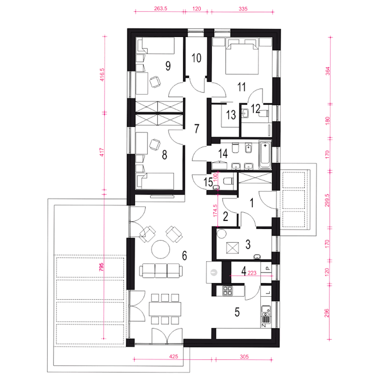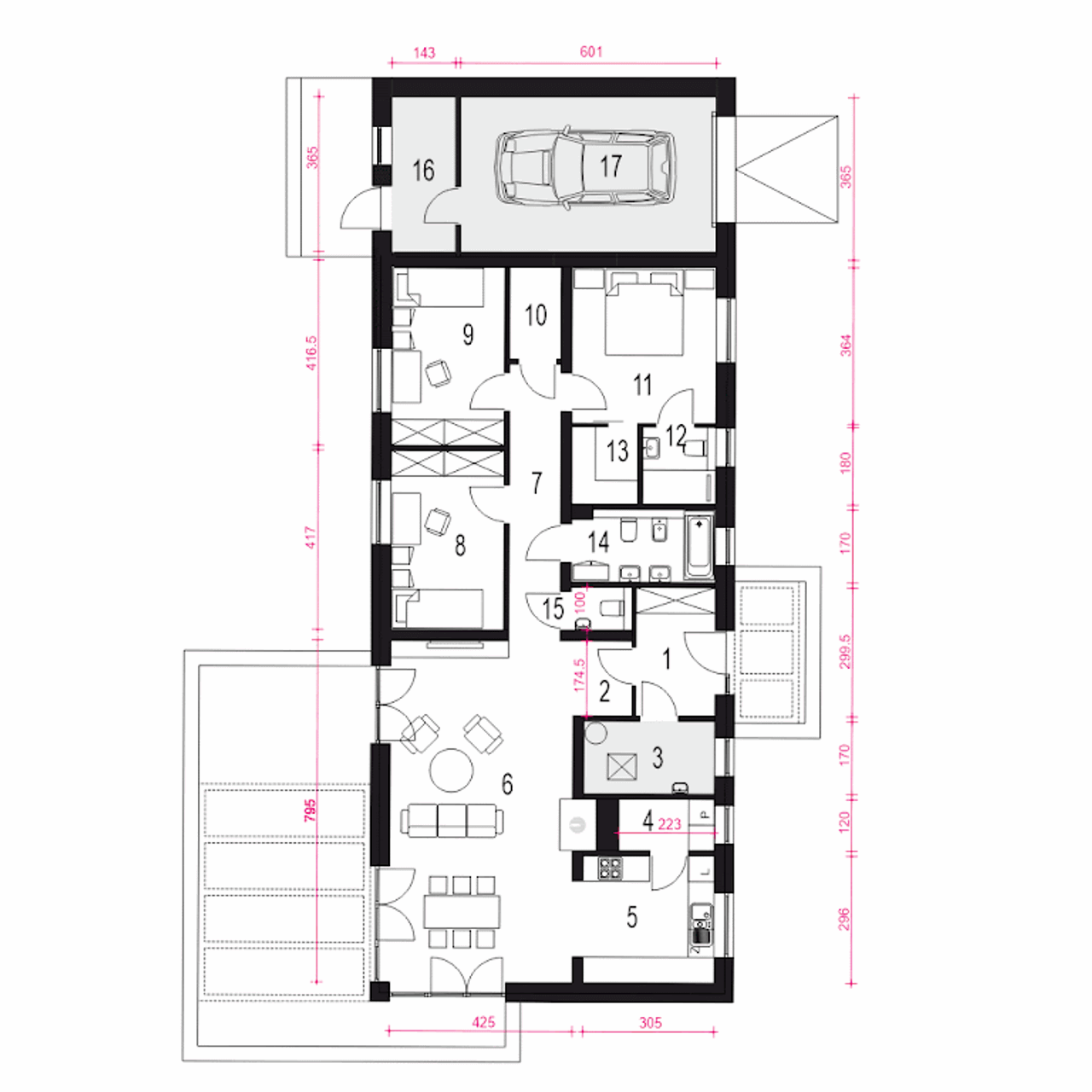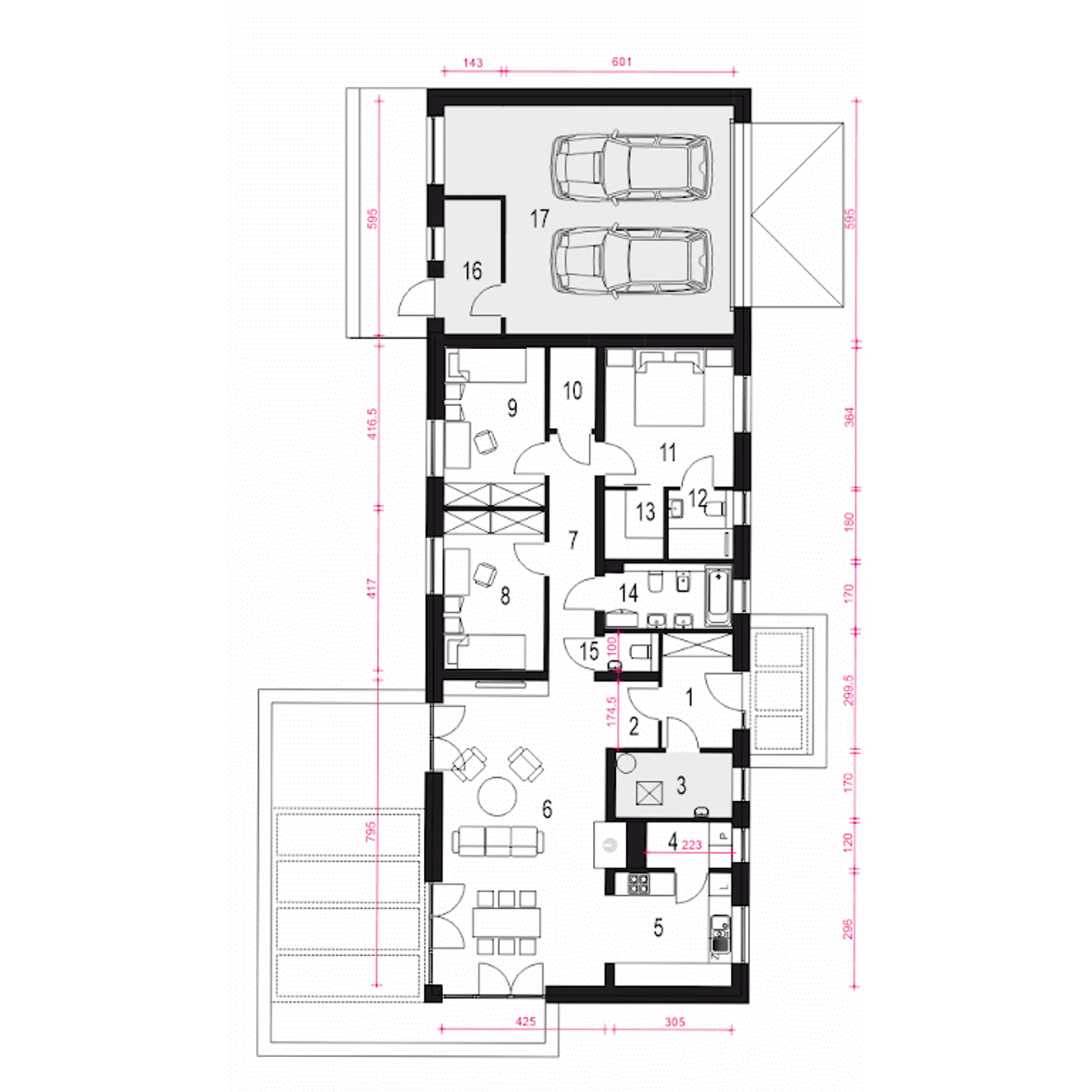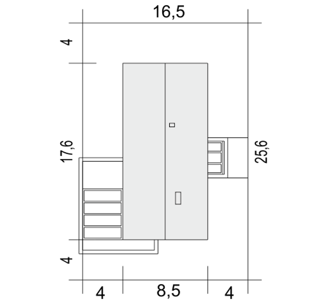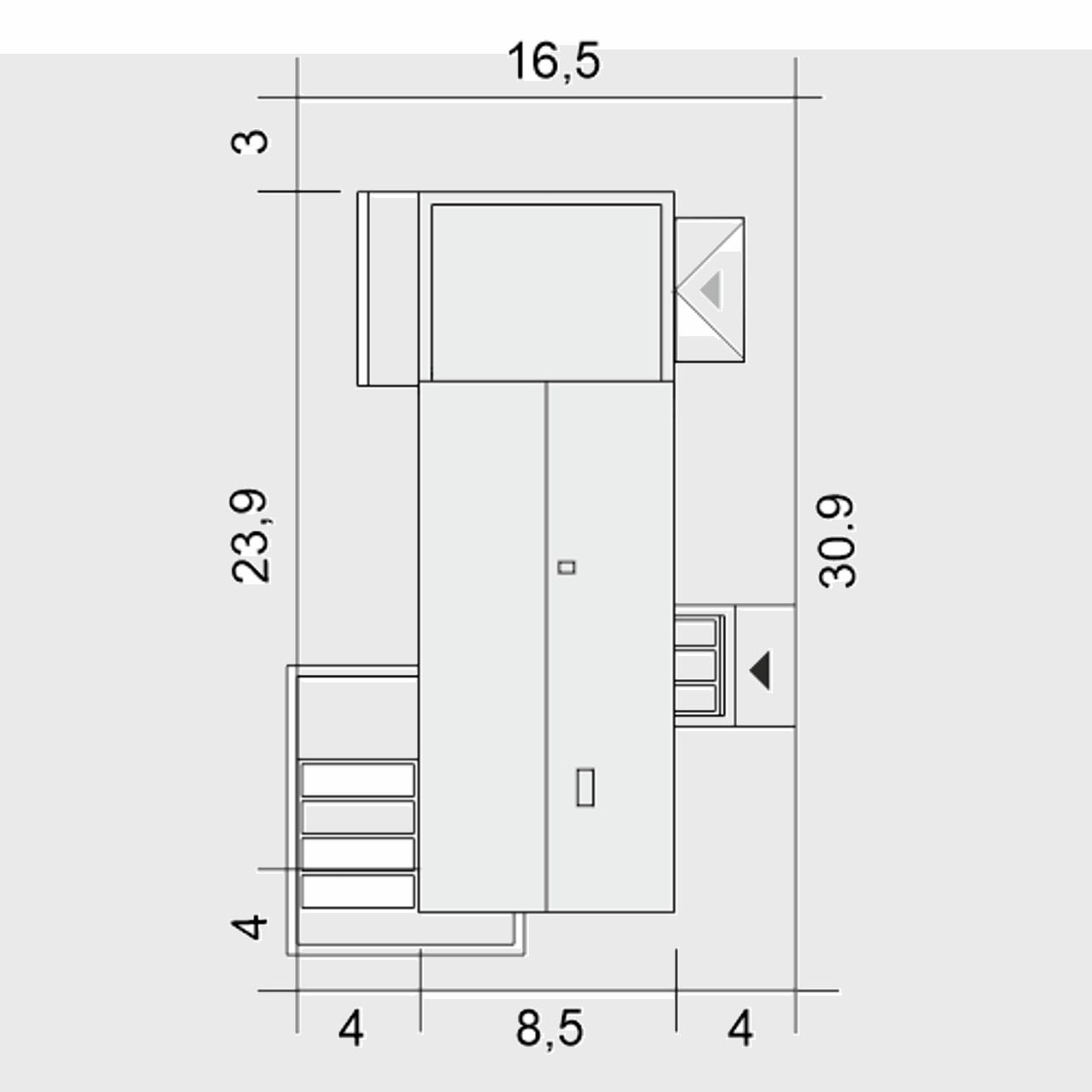 Wypełnij formularz i otrzymaj rysunki w pdf z dokładnymi wymiarami budynku i pomieszczeń (długość, szerokość, wysokość) dla projektu Flora z garażem 1-st. A