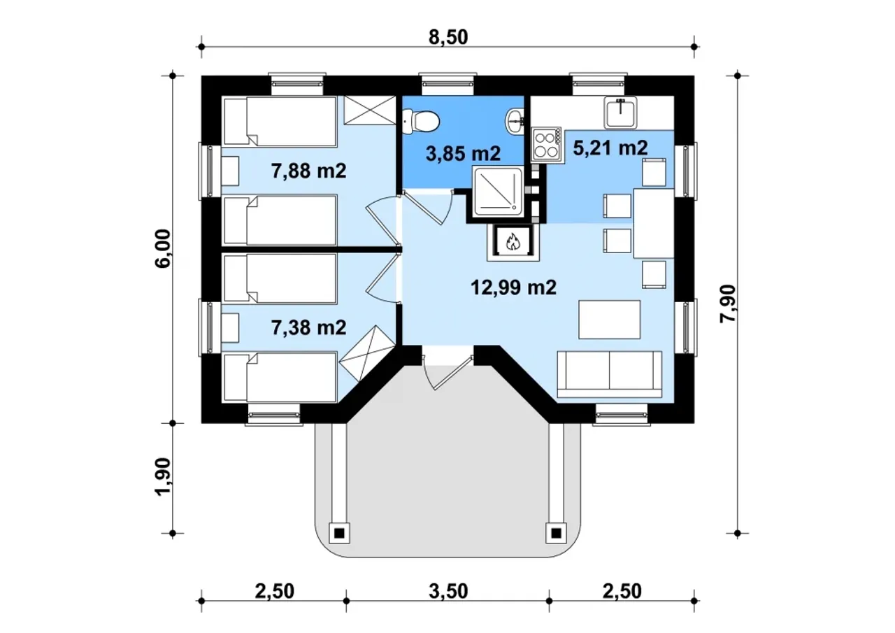 Wypełnij formularz i otrzymaj rysunki w pdf z dokładnymi wymiarami budynku i pomieszczeń (długość, szerokość, wysokość) dla projektu G132 - Budynek letniskowy