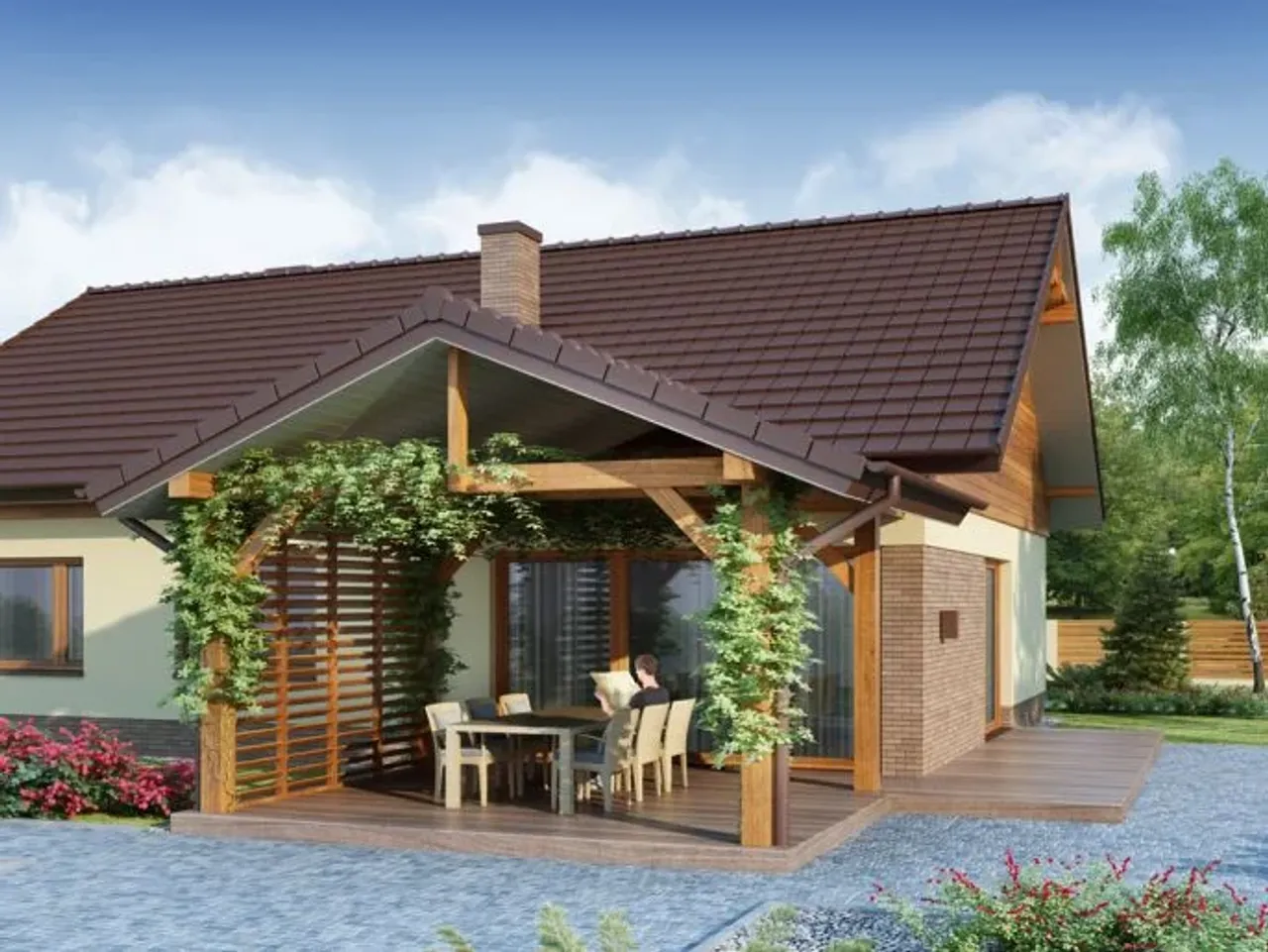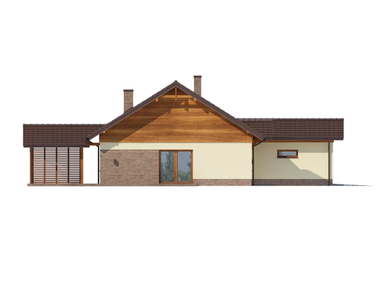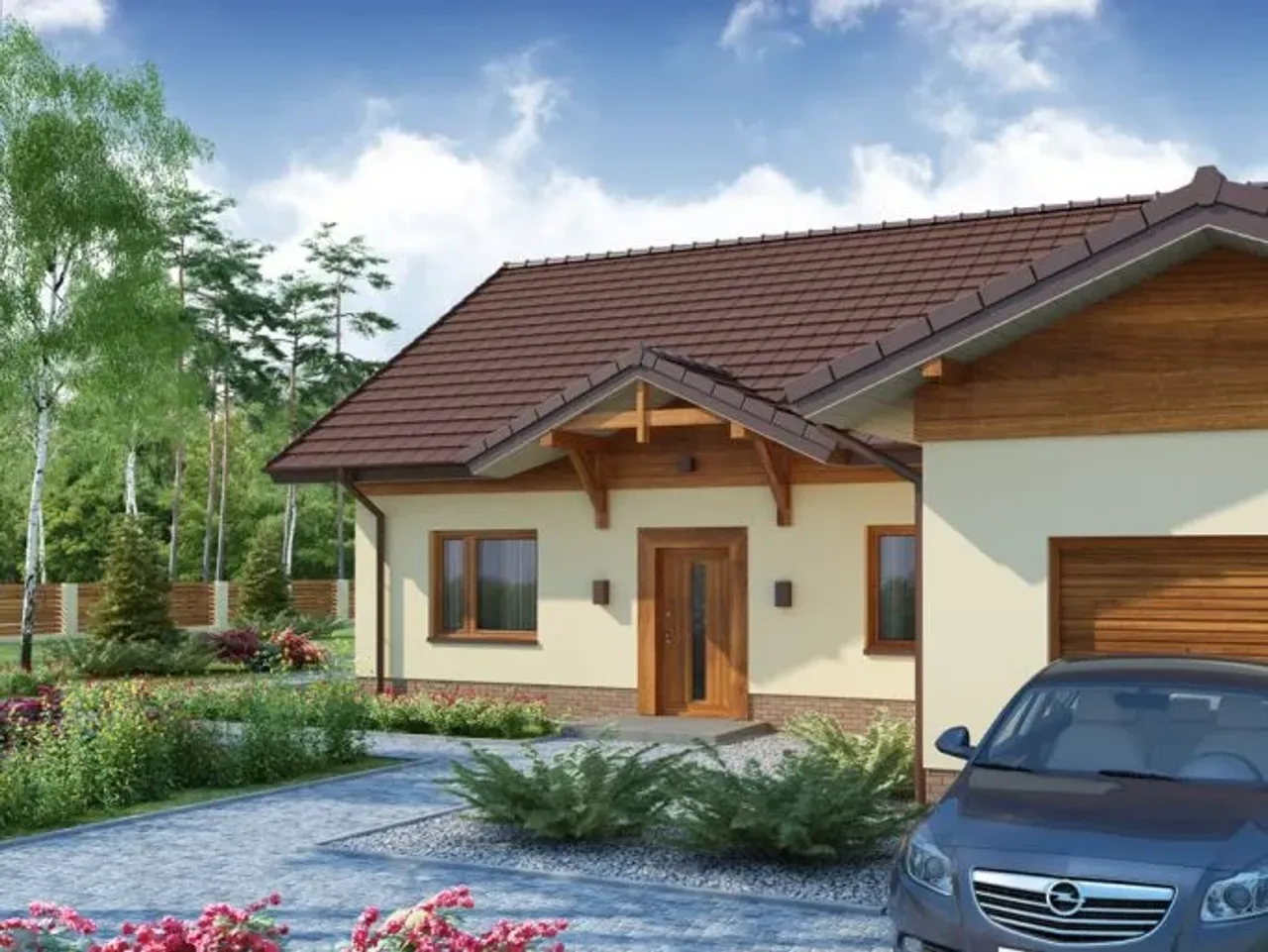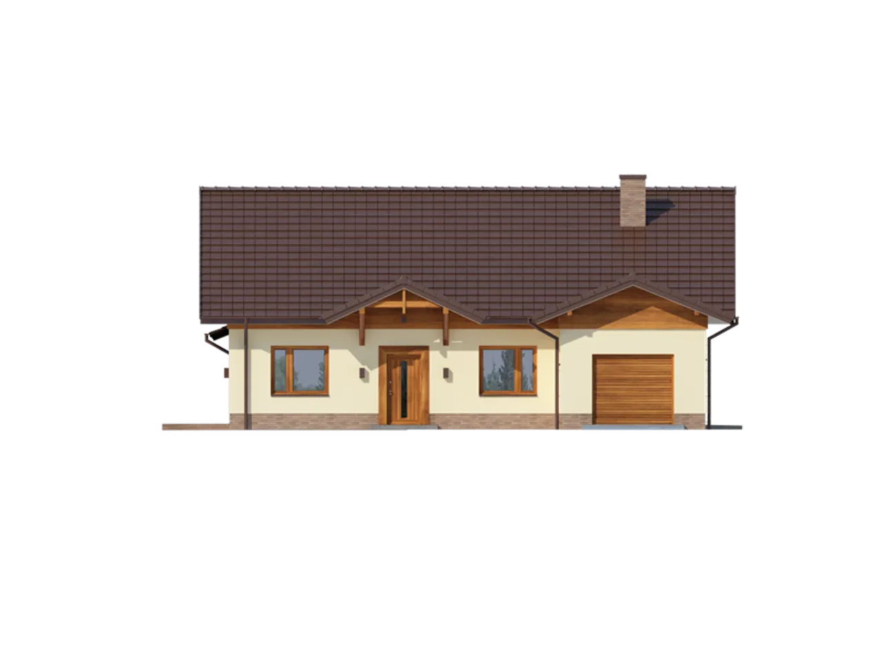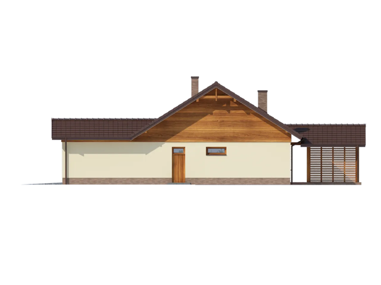 Projekt domu Gabriel PS to parterowy dom pokryty dachem dwuspadowym, budynek dzięki swoim gabarytom idealnie nadaje się na węższe działki. Od strony frontowej znajduje się zadaszone wejście do domu oraz wjazd do garażu jednostanowiskowego. W projekcie domu Gabriel PS wewnątrz budynku znajdują się dobrze doświetlony salon oraz jadalnia, z którego możemy dostać się bezpośrednio na zadaszony taras.