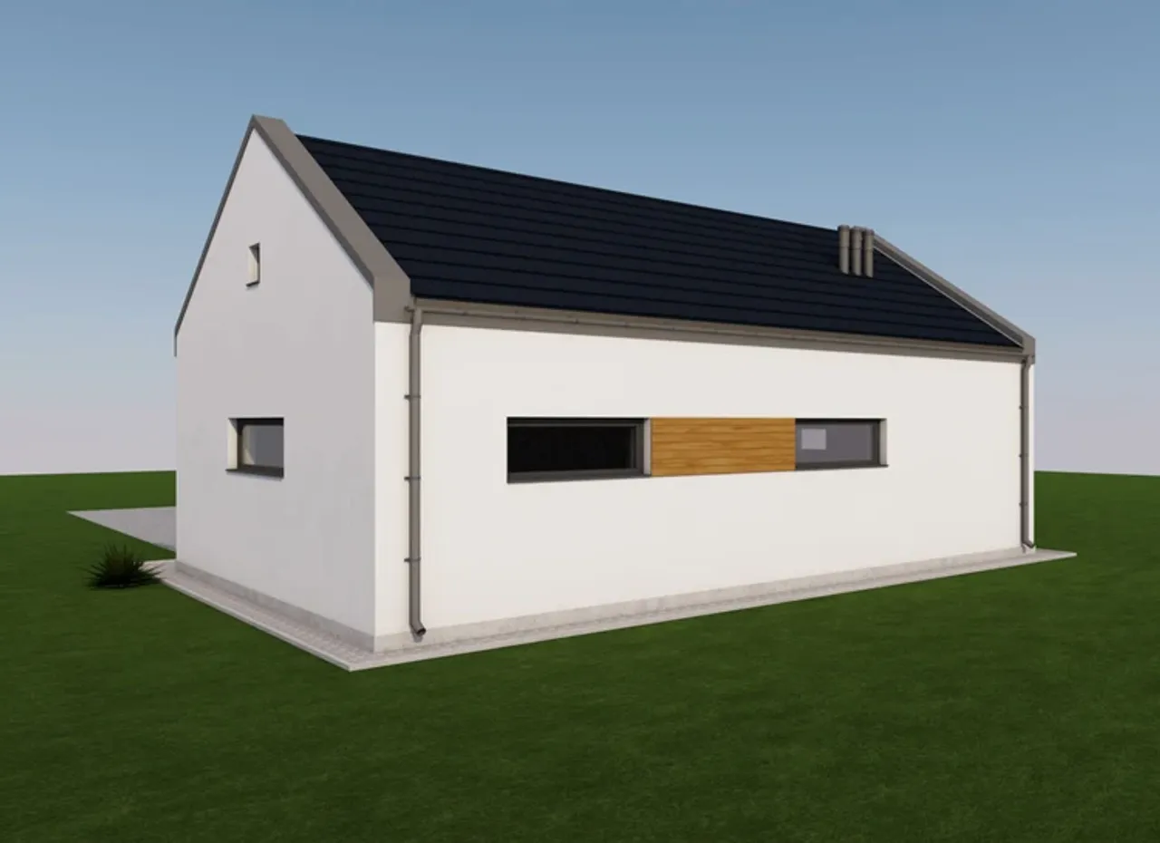 - Elewacje: tynk cienkowarstwowy mineralny w kolorze białym TO-PA001 z palety firmy Termo Organika, okładzina drewniana.