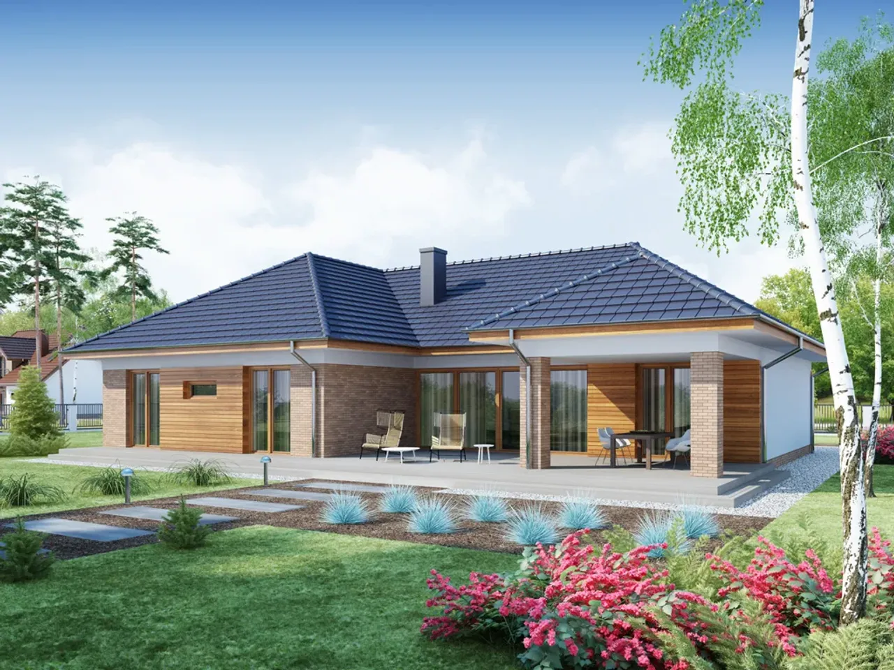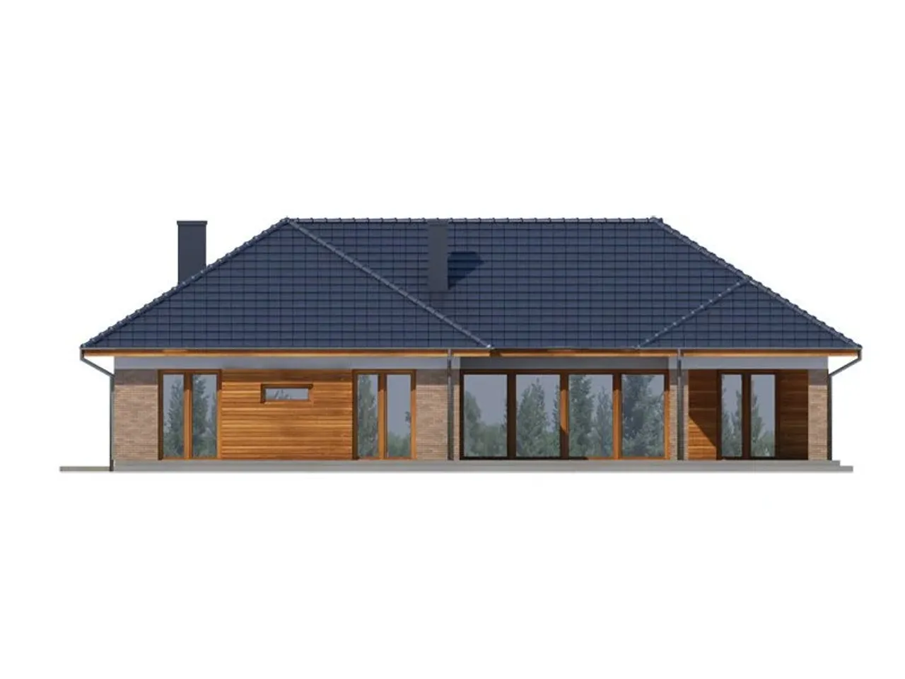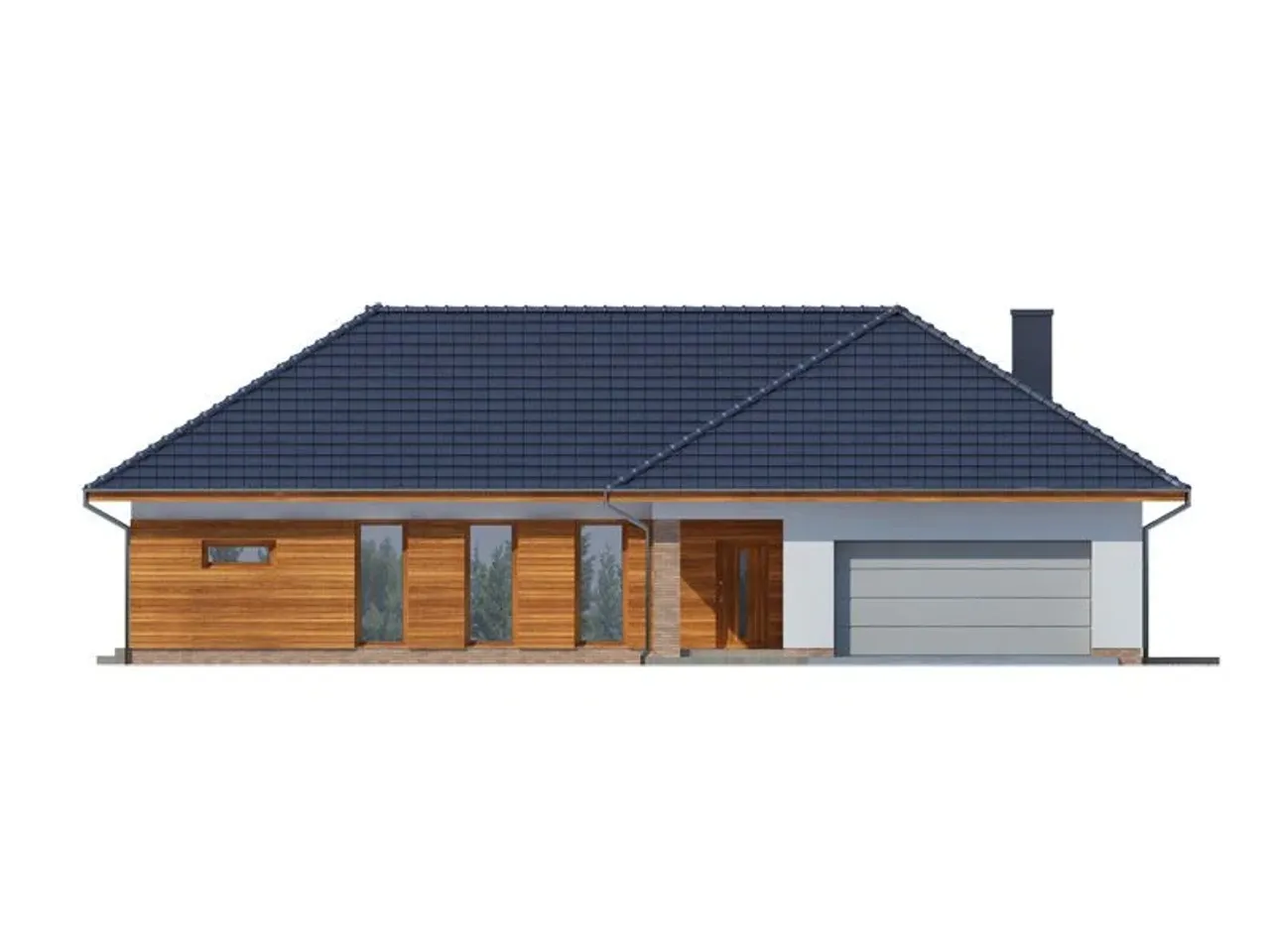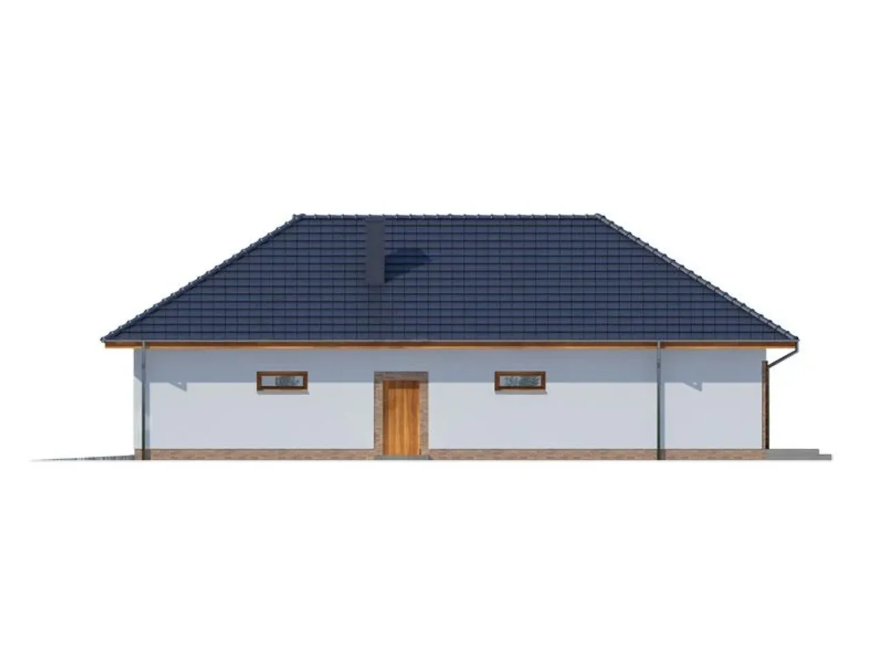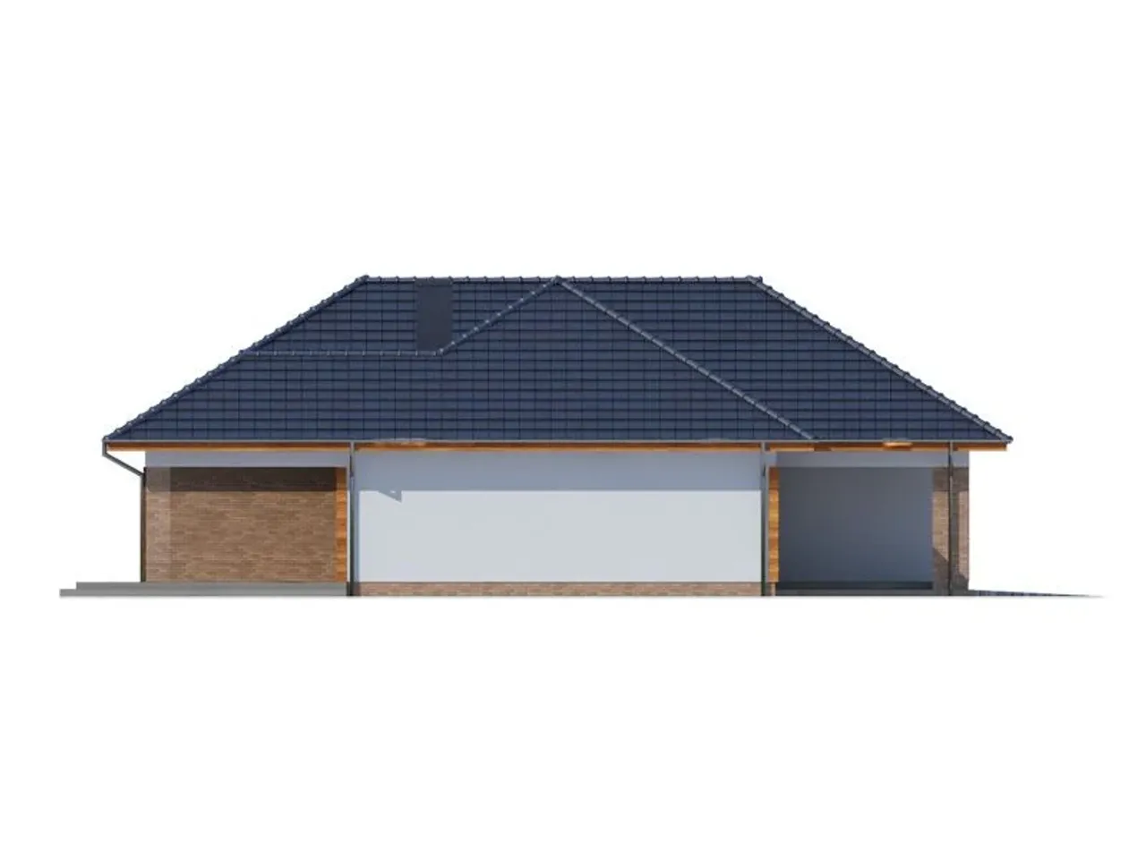 Projekt domu Georgina 2 PS to parterowy dom pokryty dachem wielospadowym, Od strony frontowej budynku znajdują się zadaszone drzwi wejściowe oraz wjazd do garażu dwustanowiskowego, z którego możemy dostać się do dużego pomieszczenia gospodarczego. W projekcie domu Georgina 2 PS salon został bardzo dobrze doświetlony światłem dziennym, bezpośrednio z niego możemy dostać się na częściowo zadaszony taras.